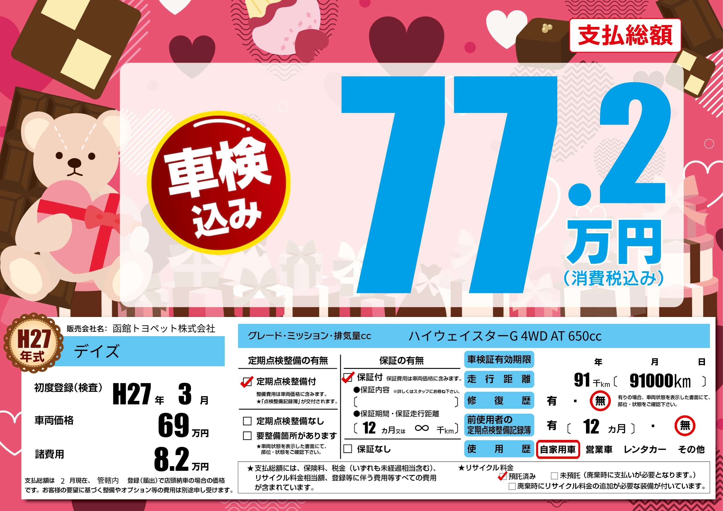 | 走行キロ | 9.1万km | 初年度登録 | H27年3月 |
