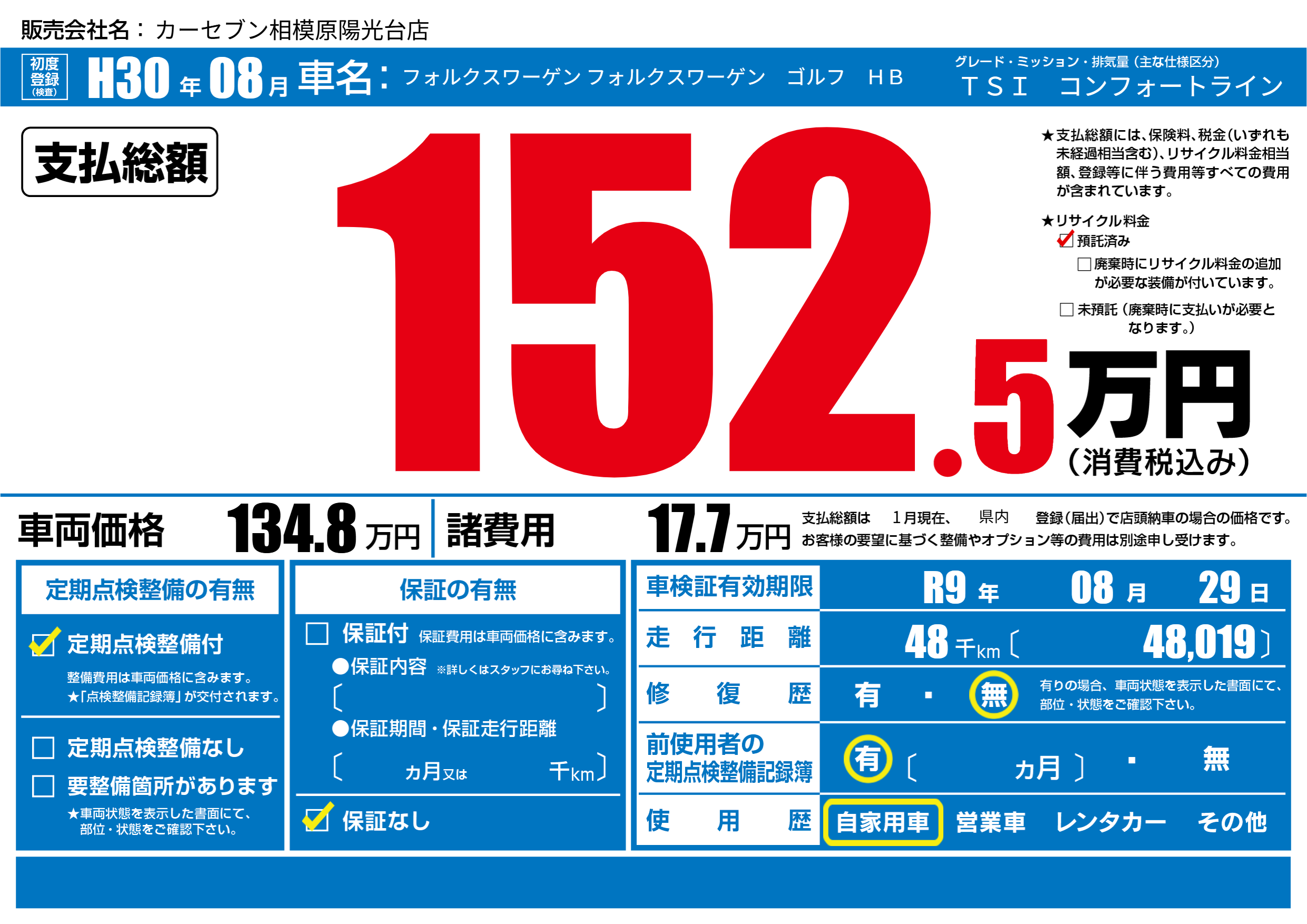 | 車名 | フォルクスワーゲン フォルクスワーゲン ゴルフ HB | グレード ミッション 排気量 |