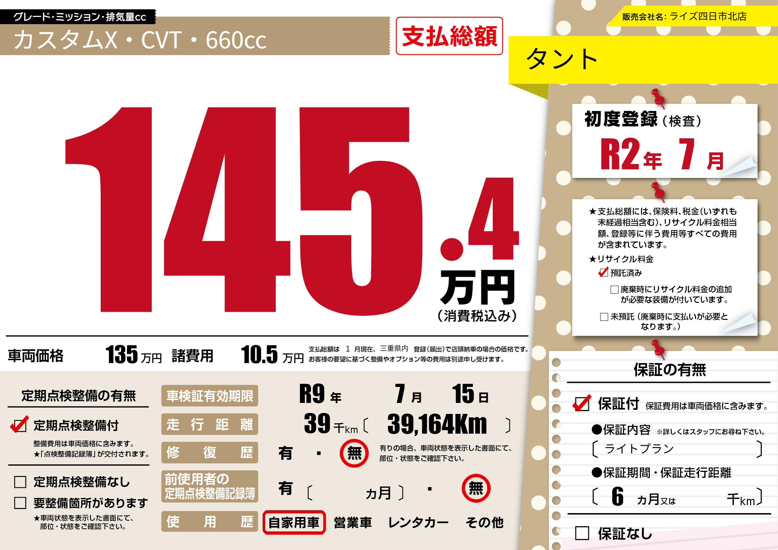 | 走行キロ | 3.9万km | 初年度登録 | R2年7月 |
