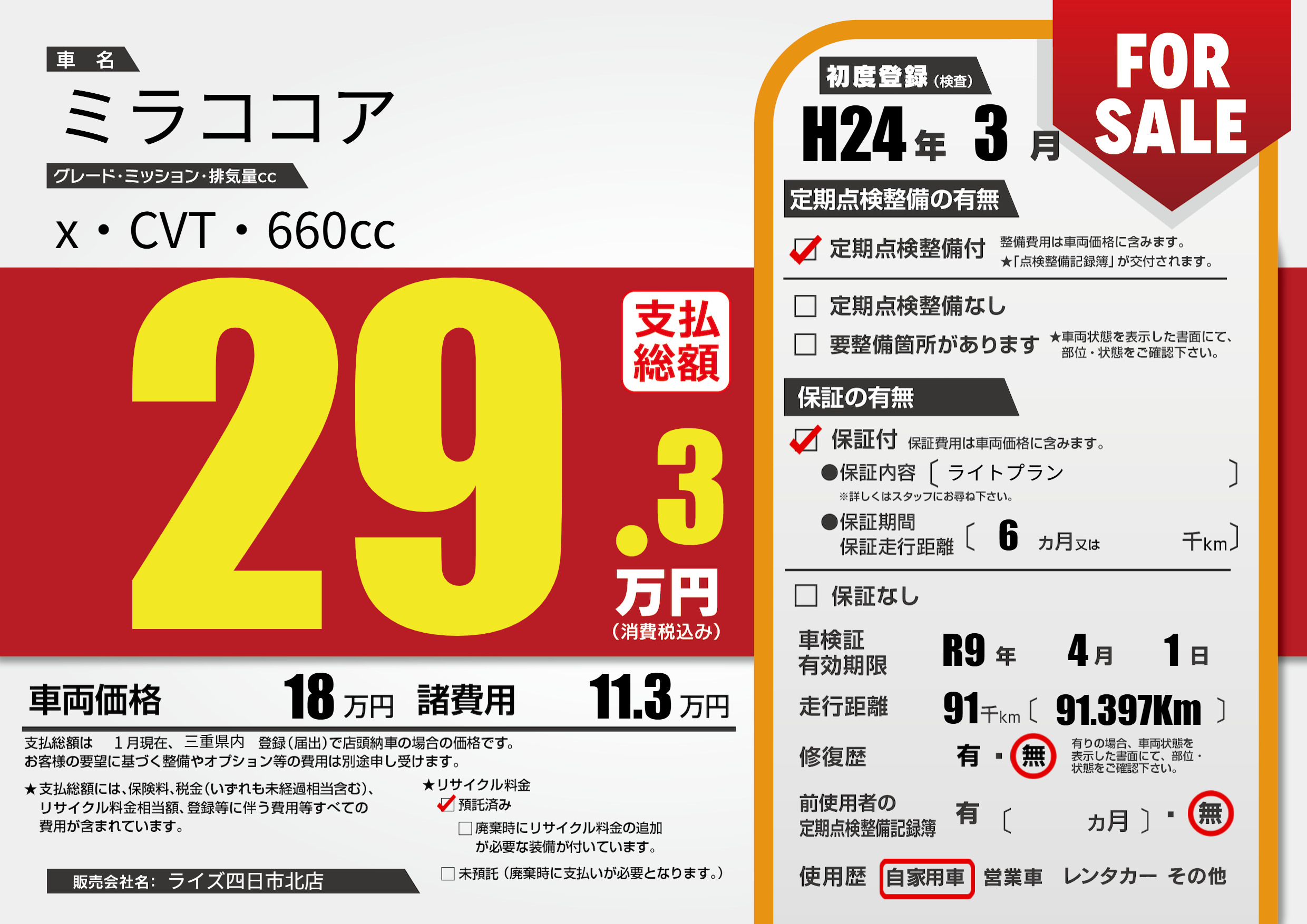 | 車名 | ミラココア | グレード ミッション 排気量 |