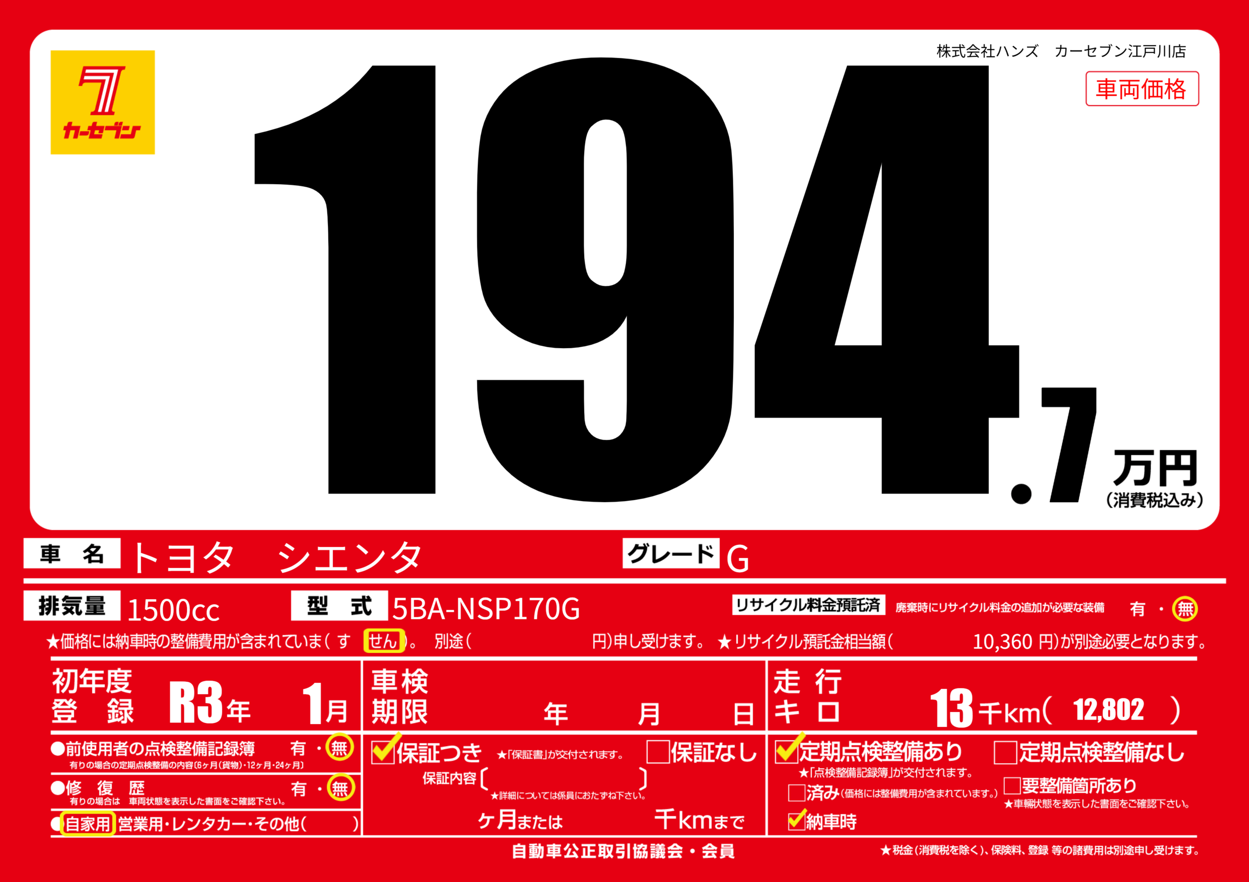 | 車名 | トヨタ シエンタ | グレード ミッション 排気量 |