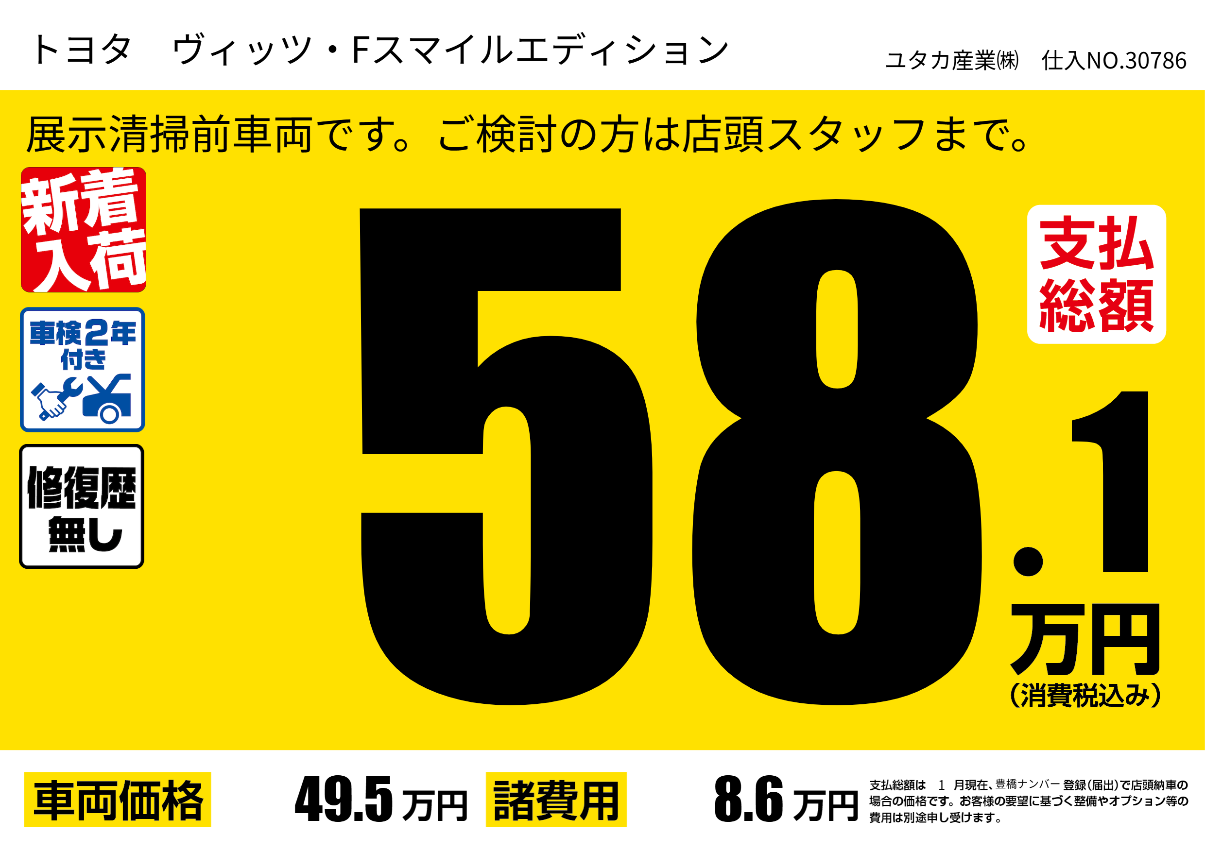 | 車名 | トヨタ ヴィッツ・Fスマイルエディション | グレード ミッション 排気量 |