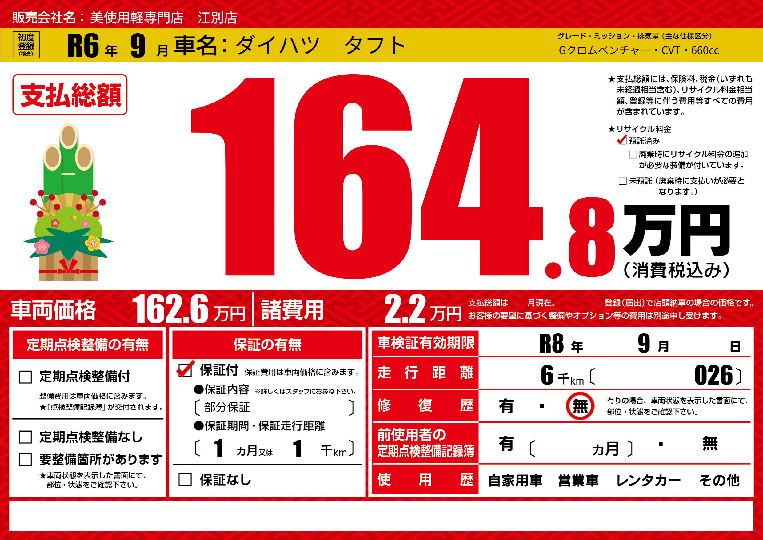 | 走行キロ | 0.6万km | 初年度登録 | R6年9月 |