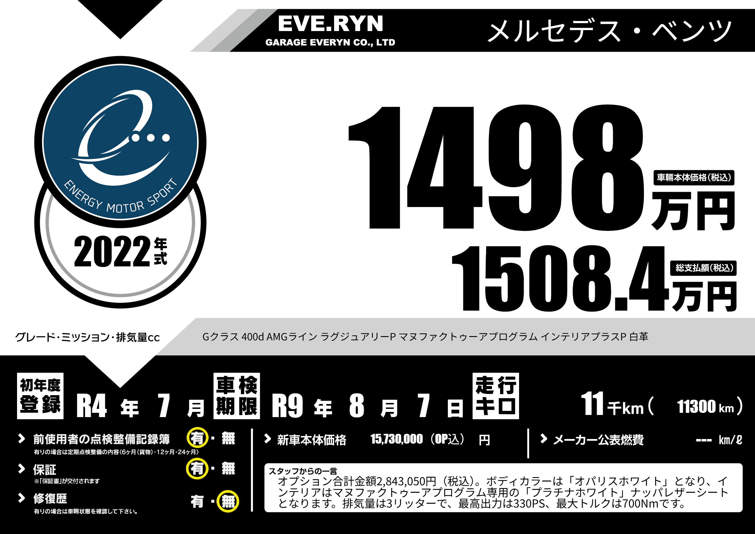 | 走行キロ | 1.1万km | 初年度登録 | R4年7月 |