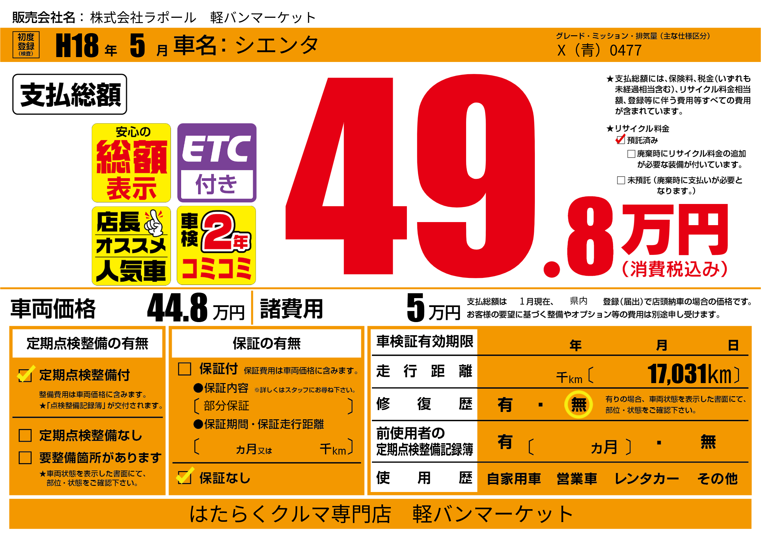 | 車名 | シエンタ | グレード ミッション 排気量 |