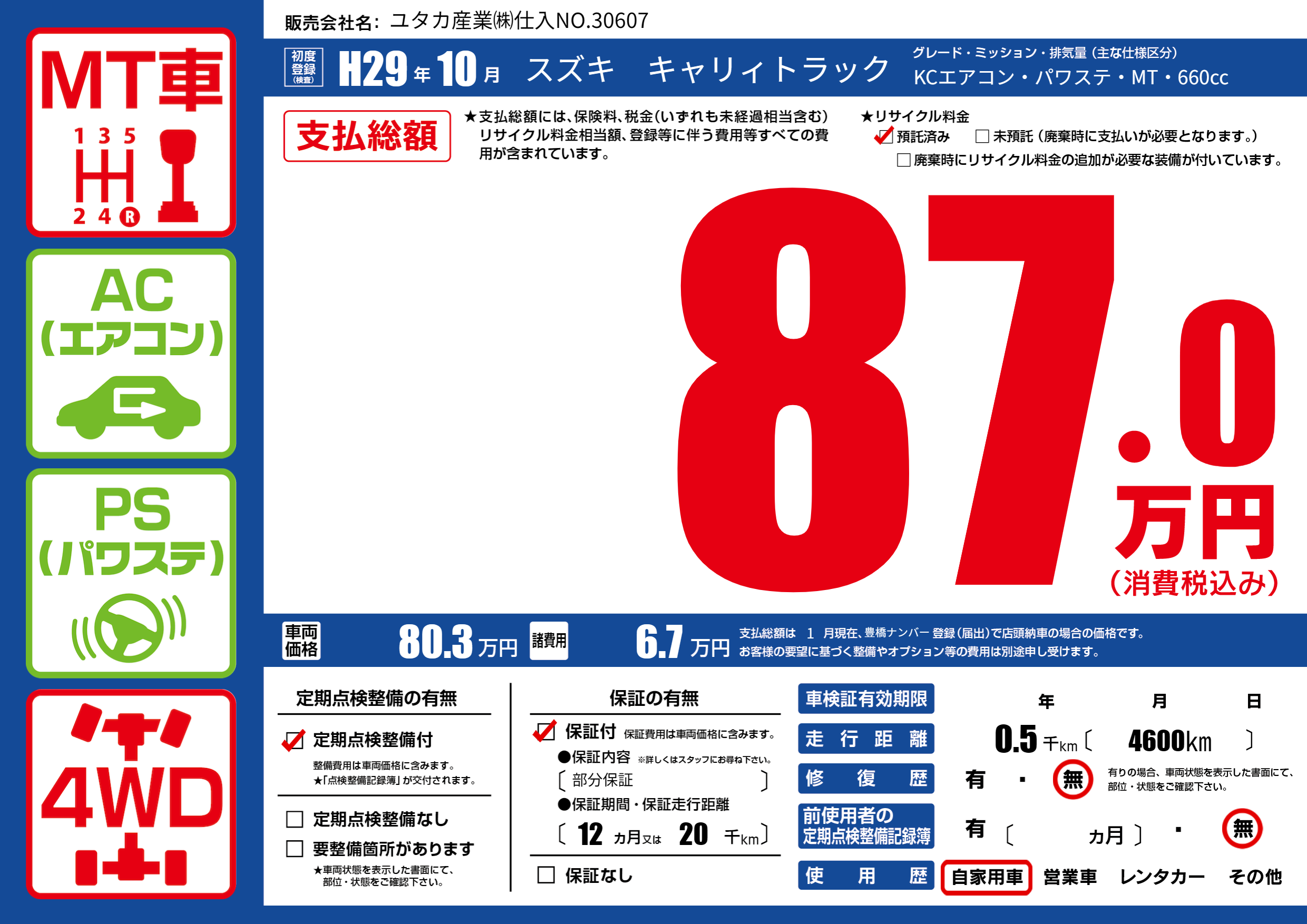 | 車名 | スズキ キャリィトラック | グレード ミッション 排気量 |