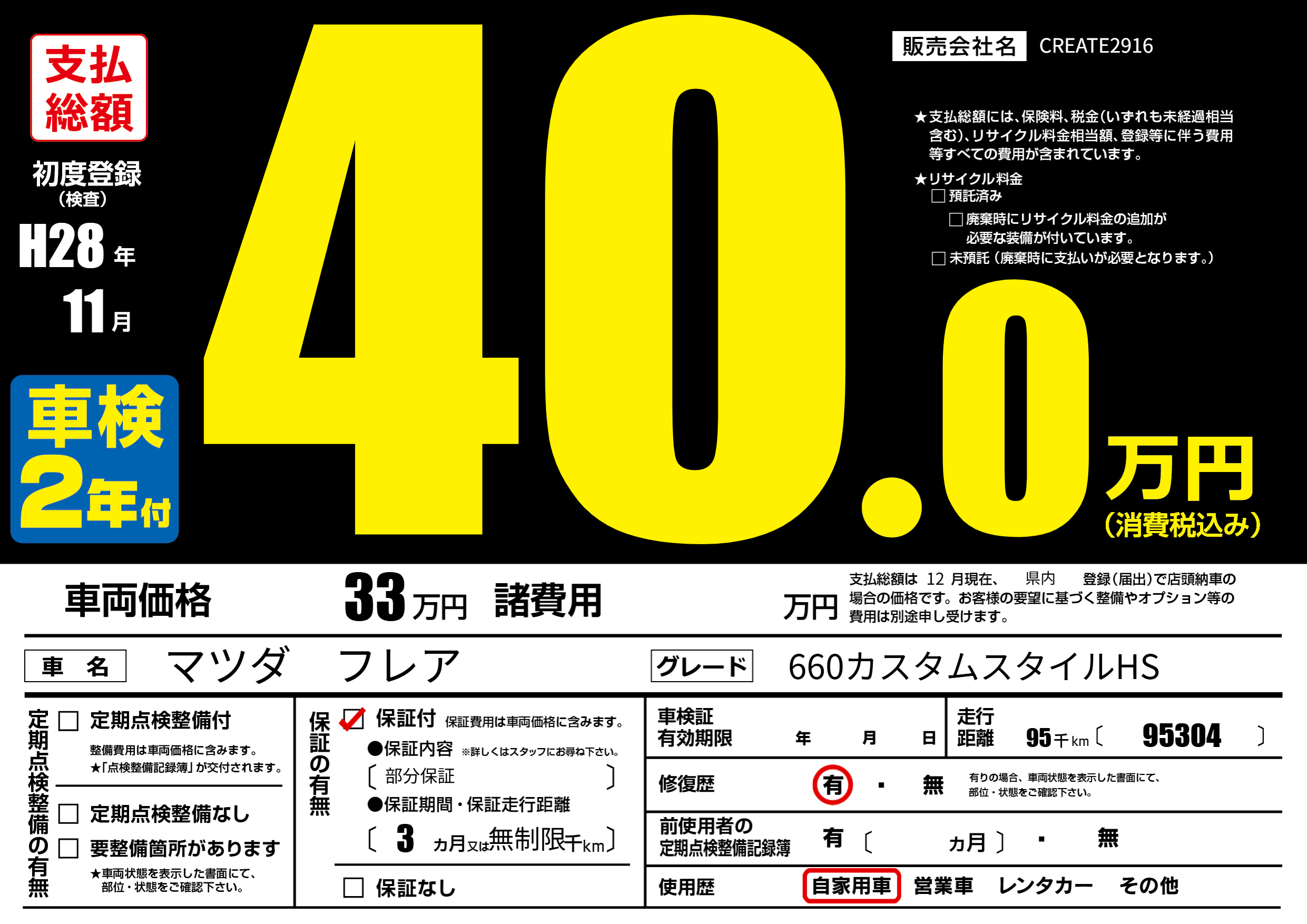 | 走行キロ | 9.5万km | 初年度登録 | H28年11月 |