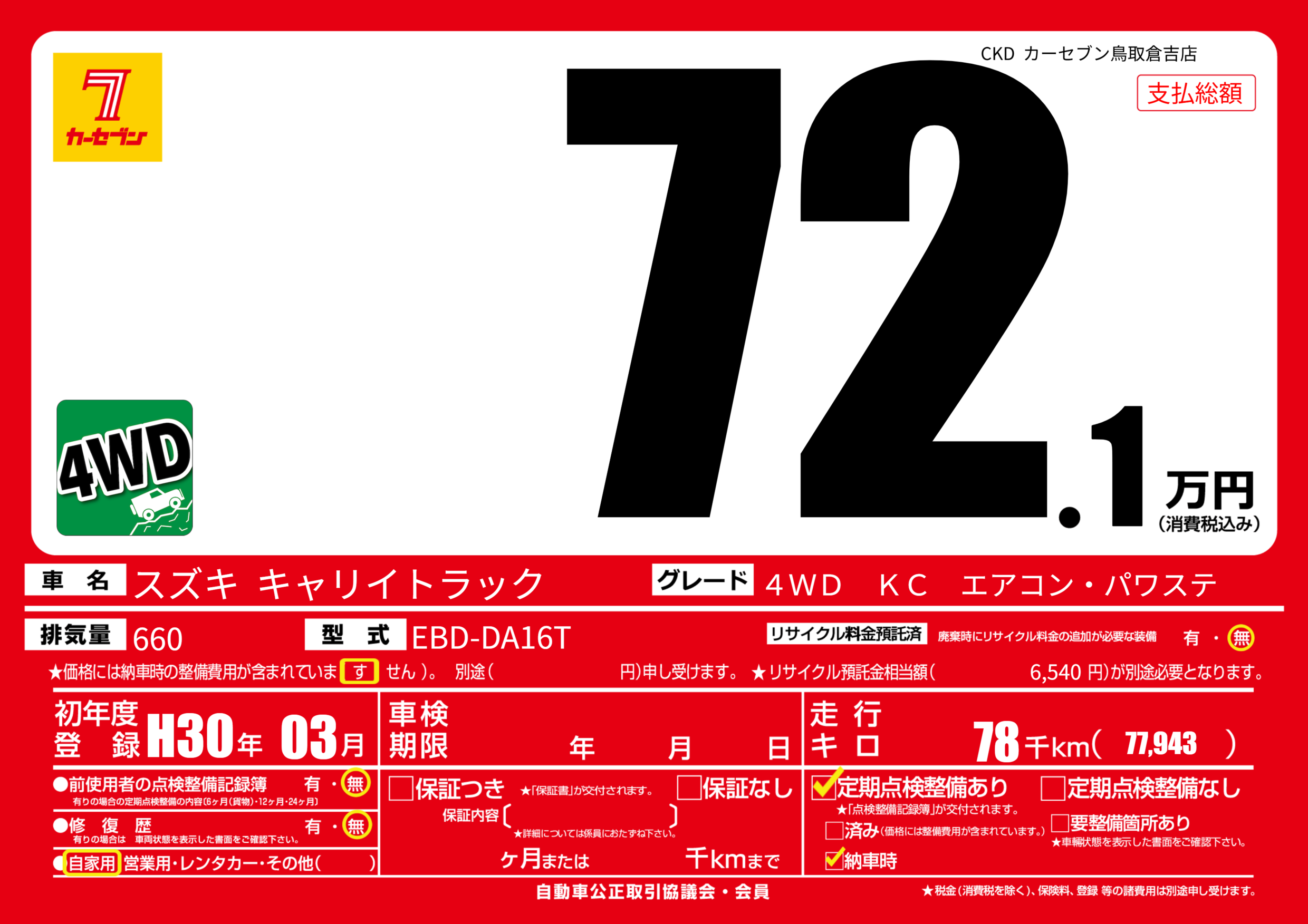 | 走行キロ | 7.8万km | 初年度登録 | H30年03月 |