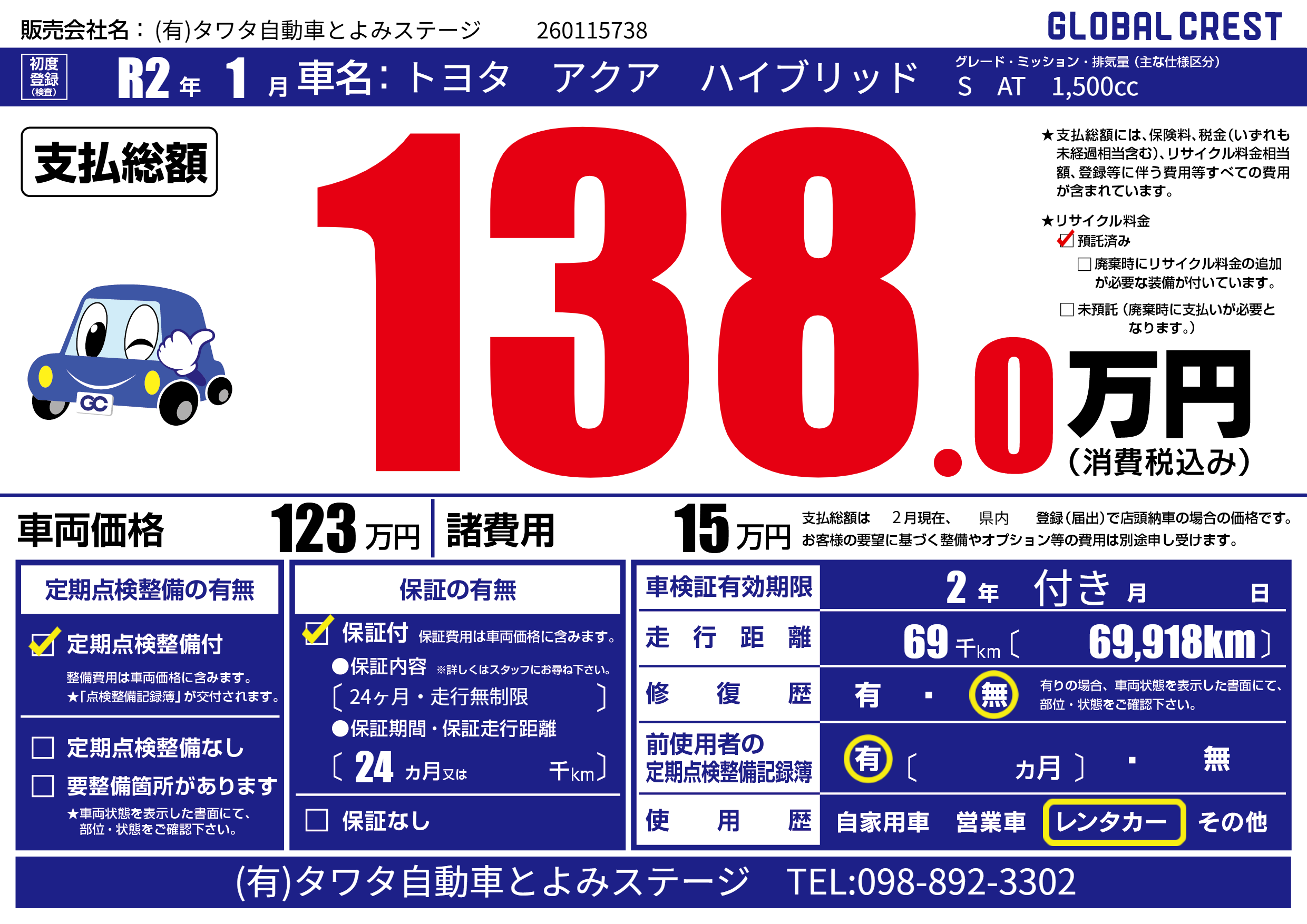 | 車名 | トヨタ アクア ハイブリッド | グレード ミッション 排気量 |