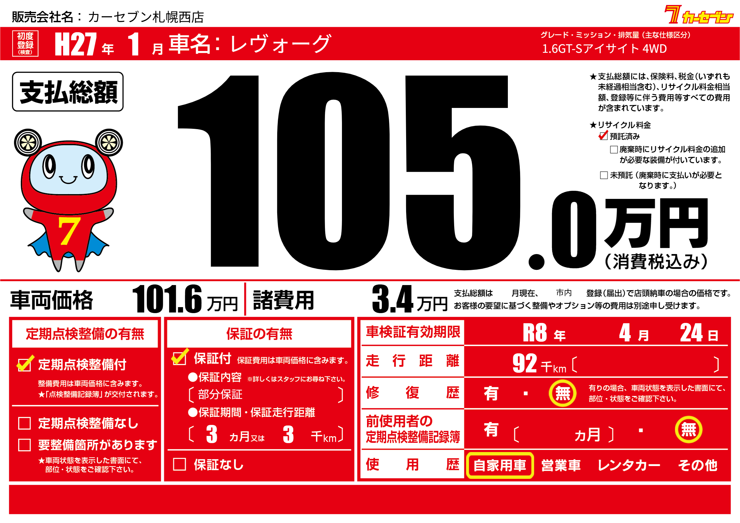 | 車名 | レヴォーグ | グレード ミッション 排気量 |