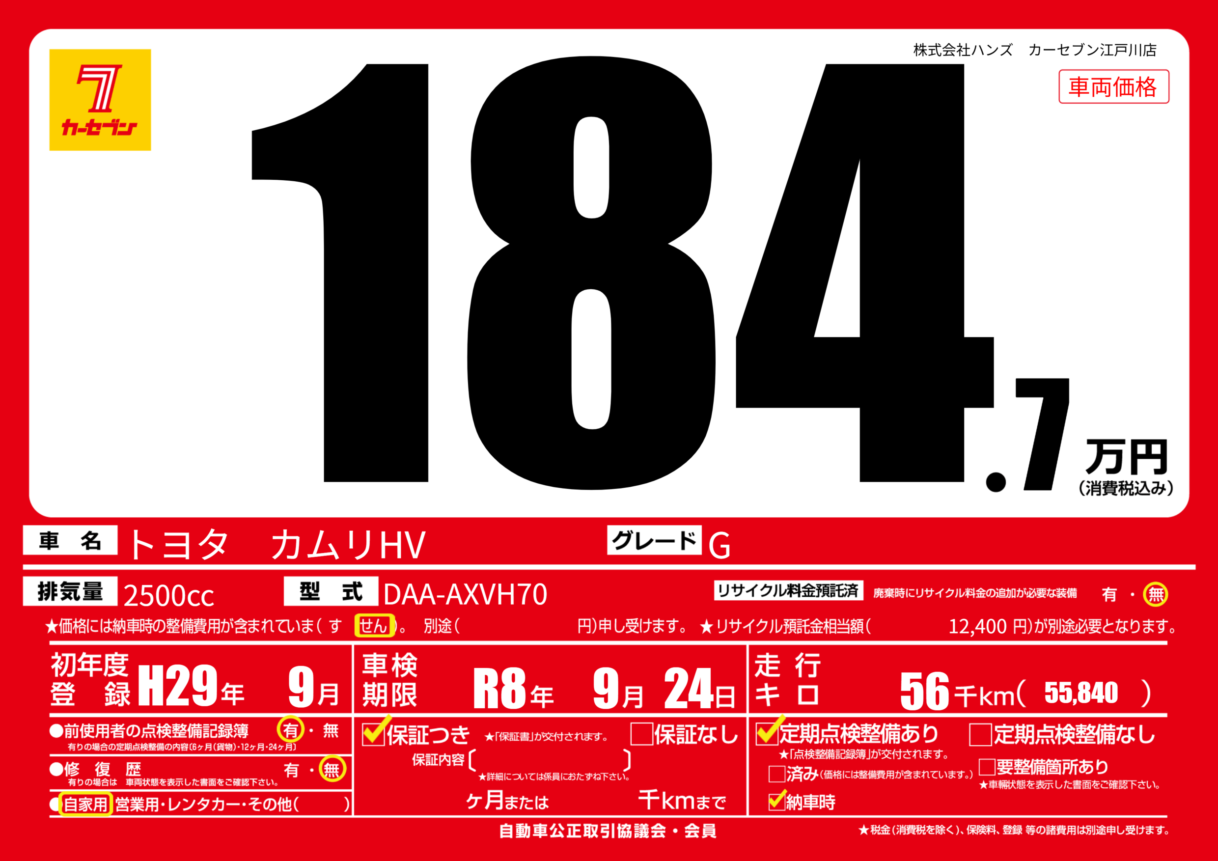 | 車名 | トヨタ カムリHV | グレード ミッション 排気量 |