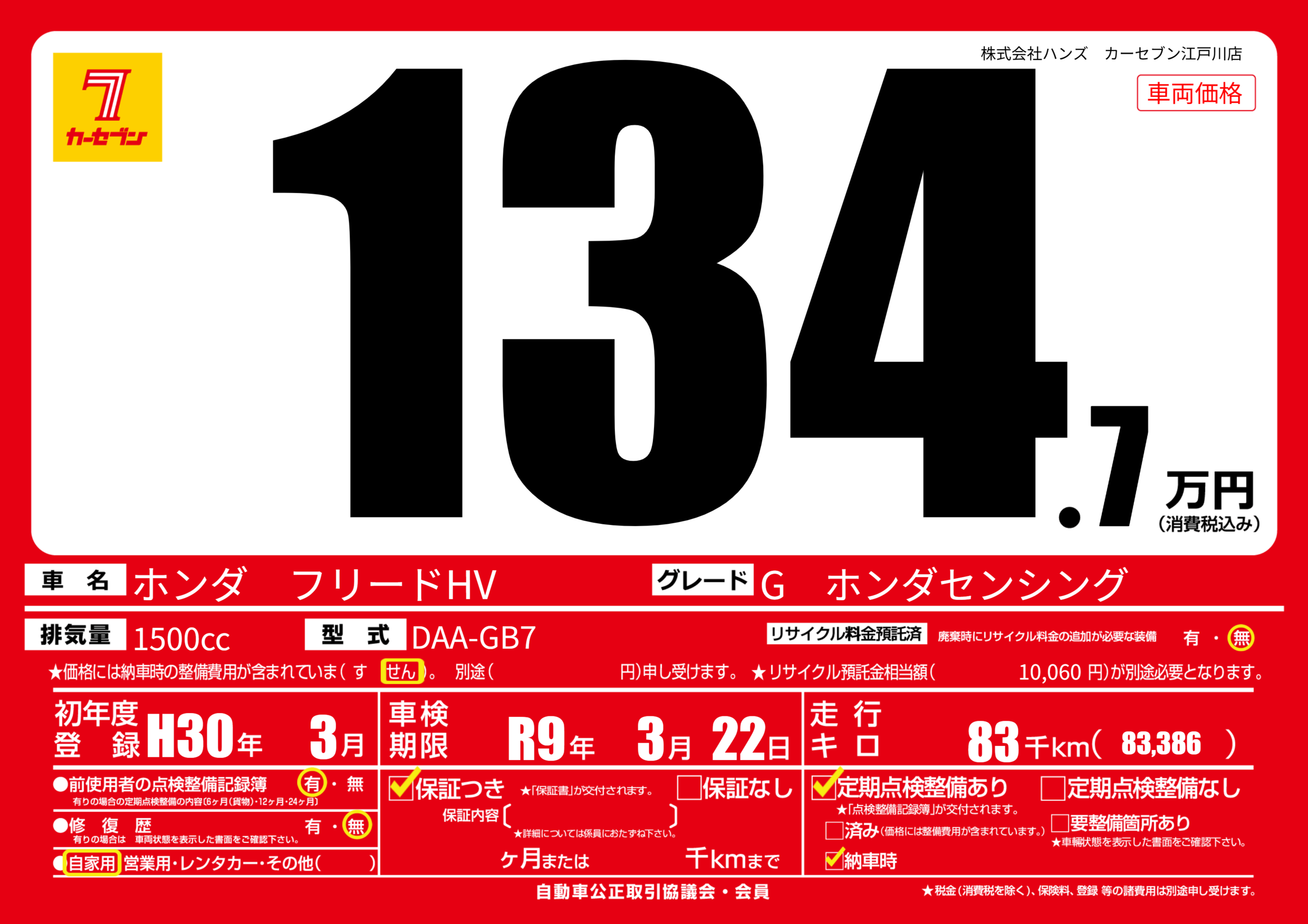 | 車名 | ホンダ フリードHV | グレード ミッション 排気量 |