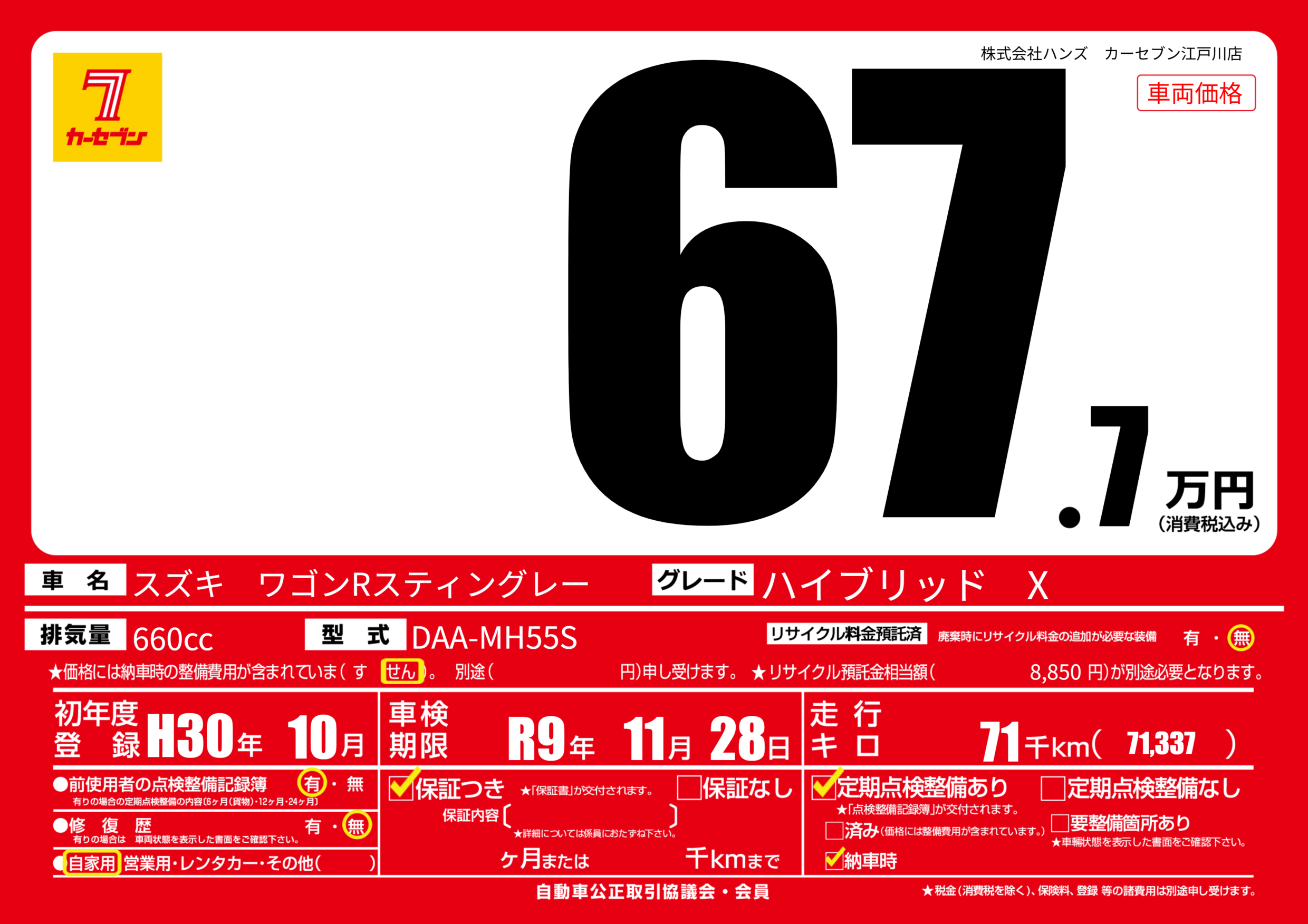 | 走行キロ | 7.1万km | 初年度登録 | H30年10月 |