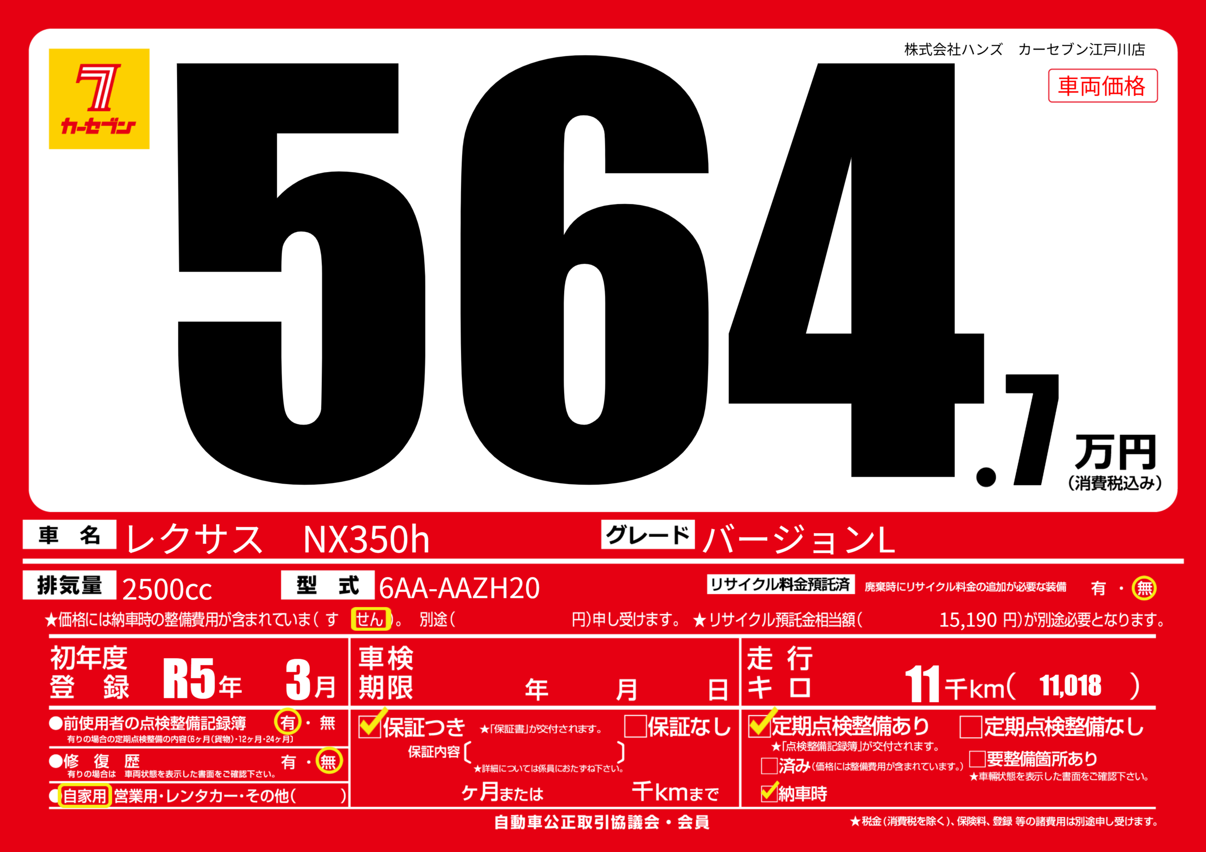 | 走行キロ | 1.1万km | 初年度登録 | R5年3月 |