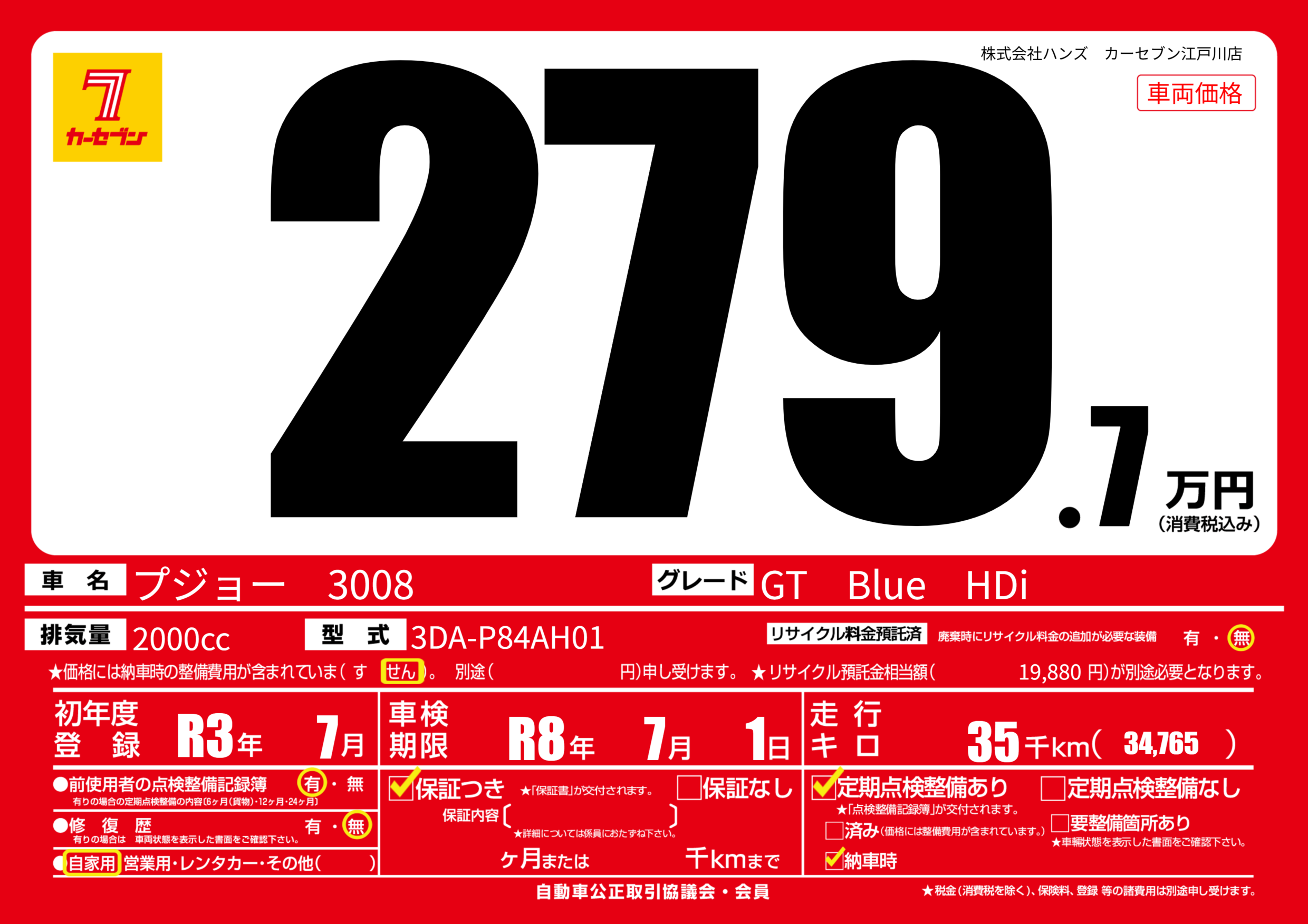 | 車名 | プジョー 3008 | グレード ミッション 排気量 |