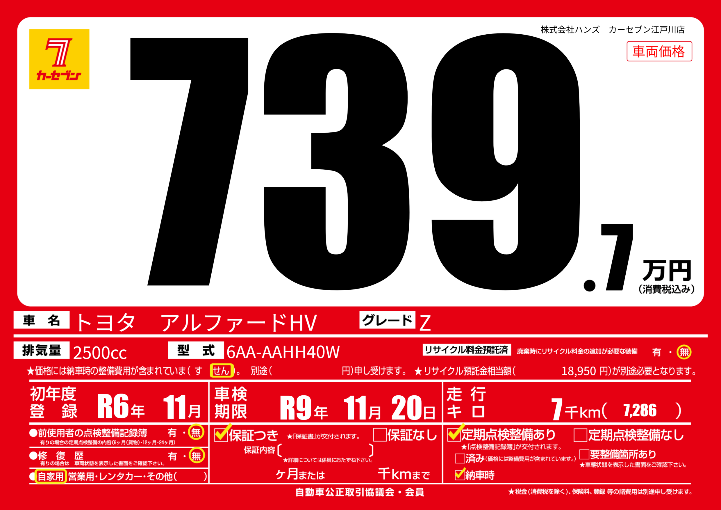 | 走行キロ | 0.7万km | 初年度登録 | R6年11月 |