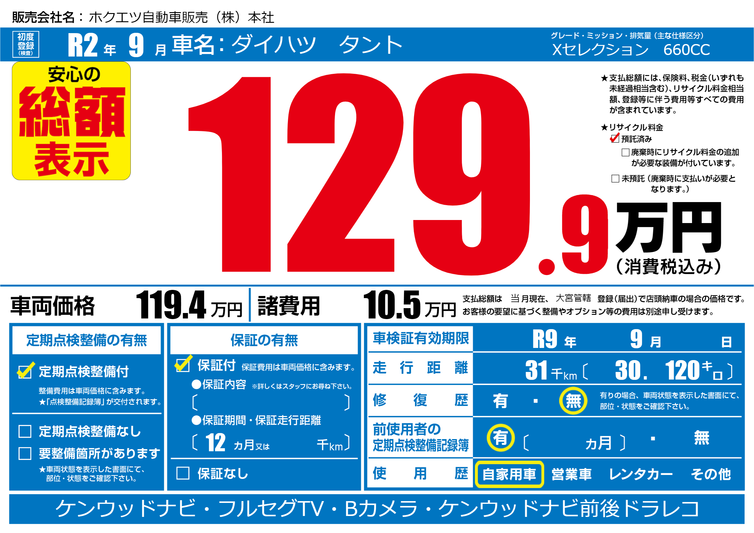 | 車検制限 | R9年 9月 - 日 | ||