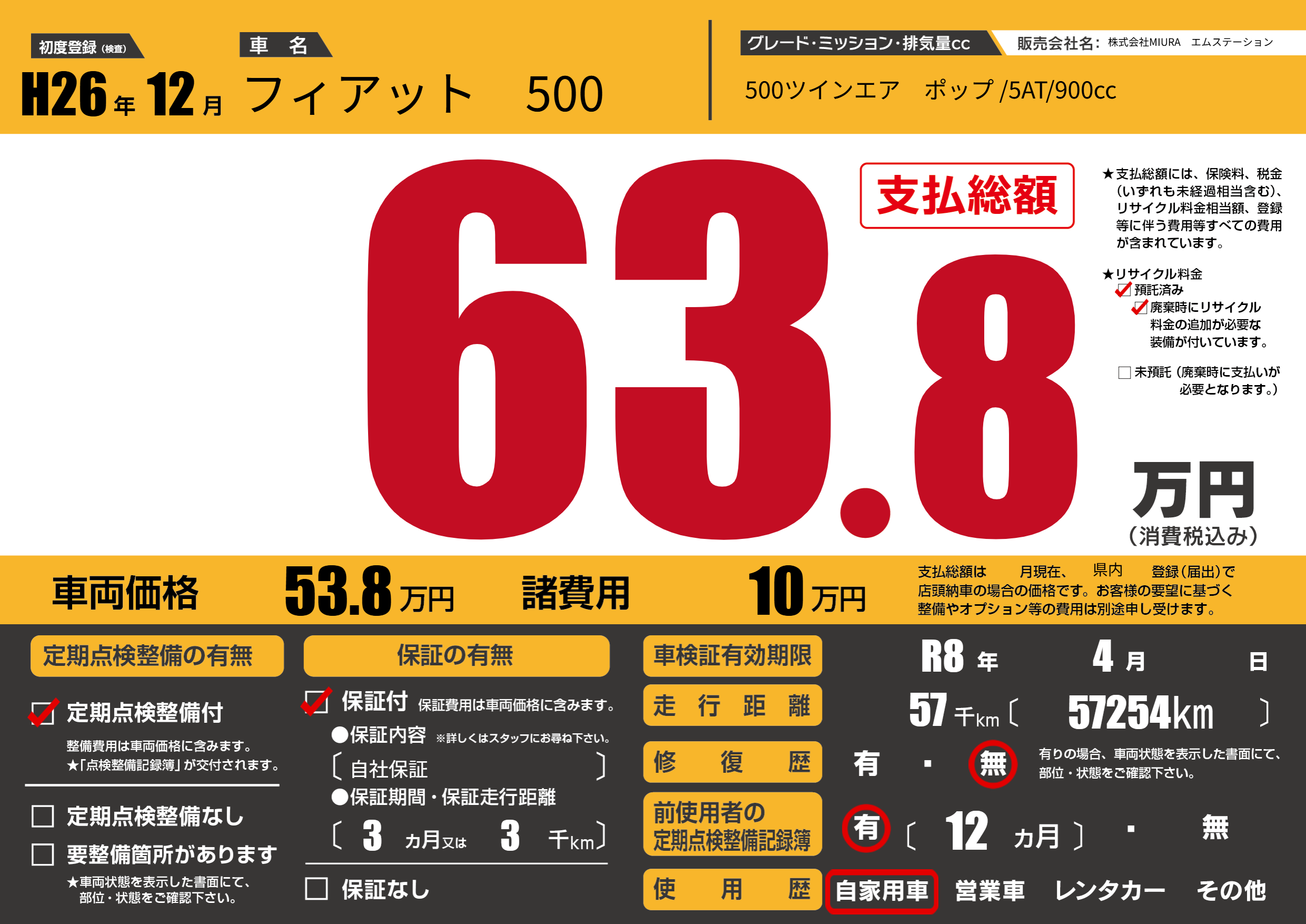 | 車名 | フィアット 500 | グレード ミッション 排気量 |