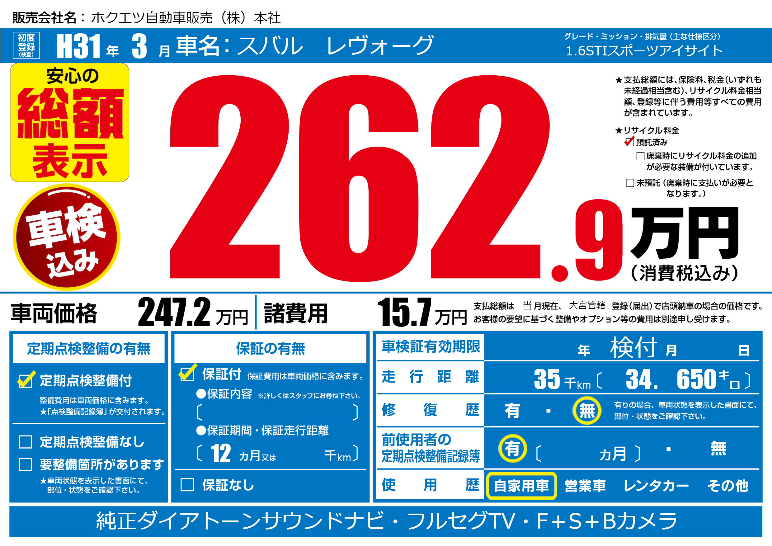 | 車名 | スバル レヴォーグ | グレード ミッション 排気量 |