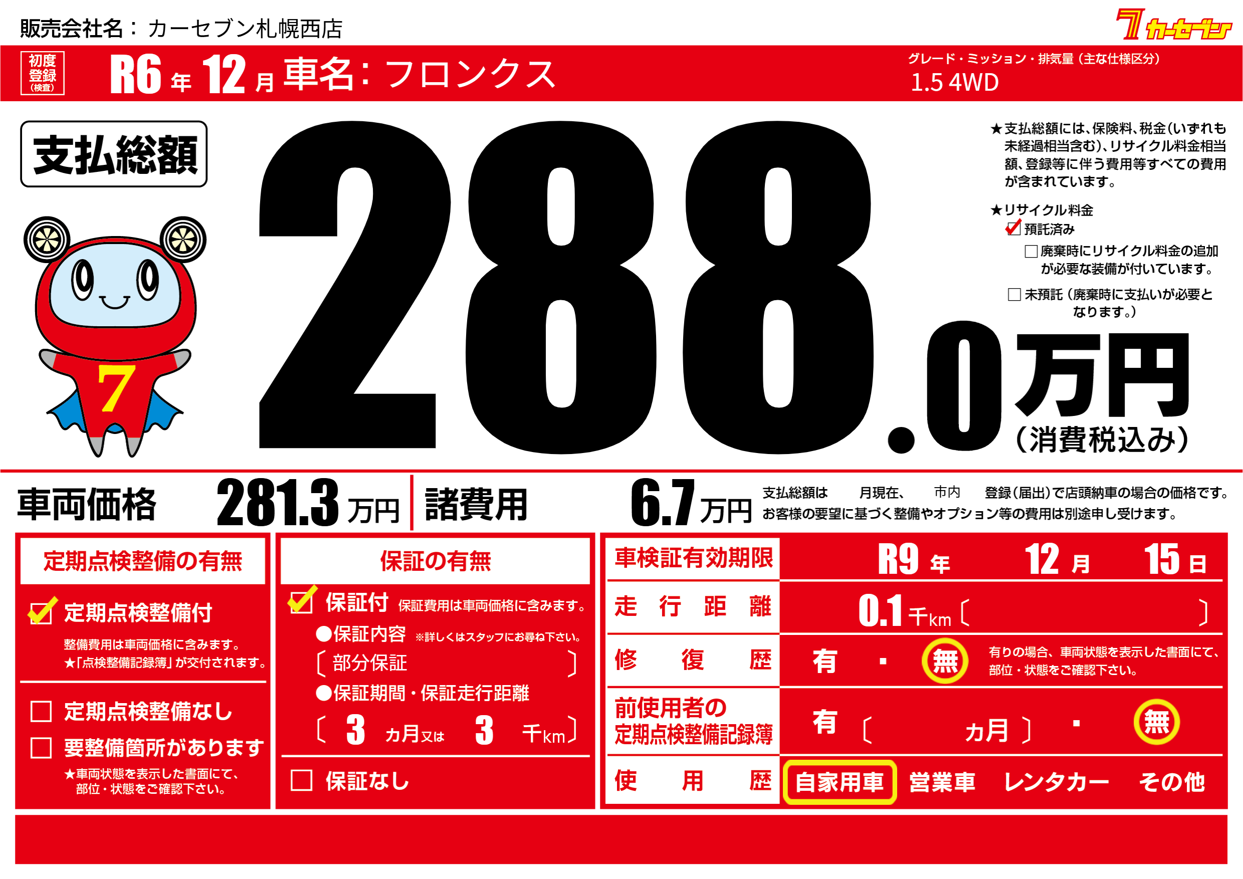 なし | 車検制限 | R9年12月15月 |