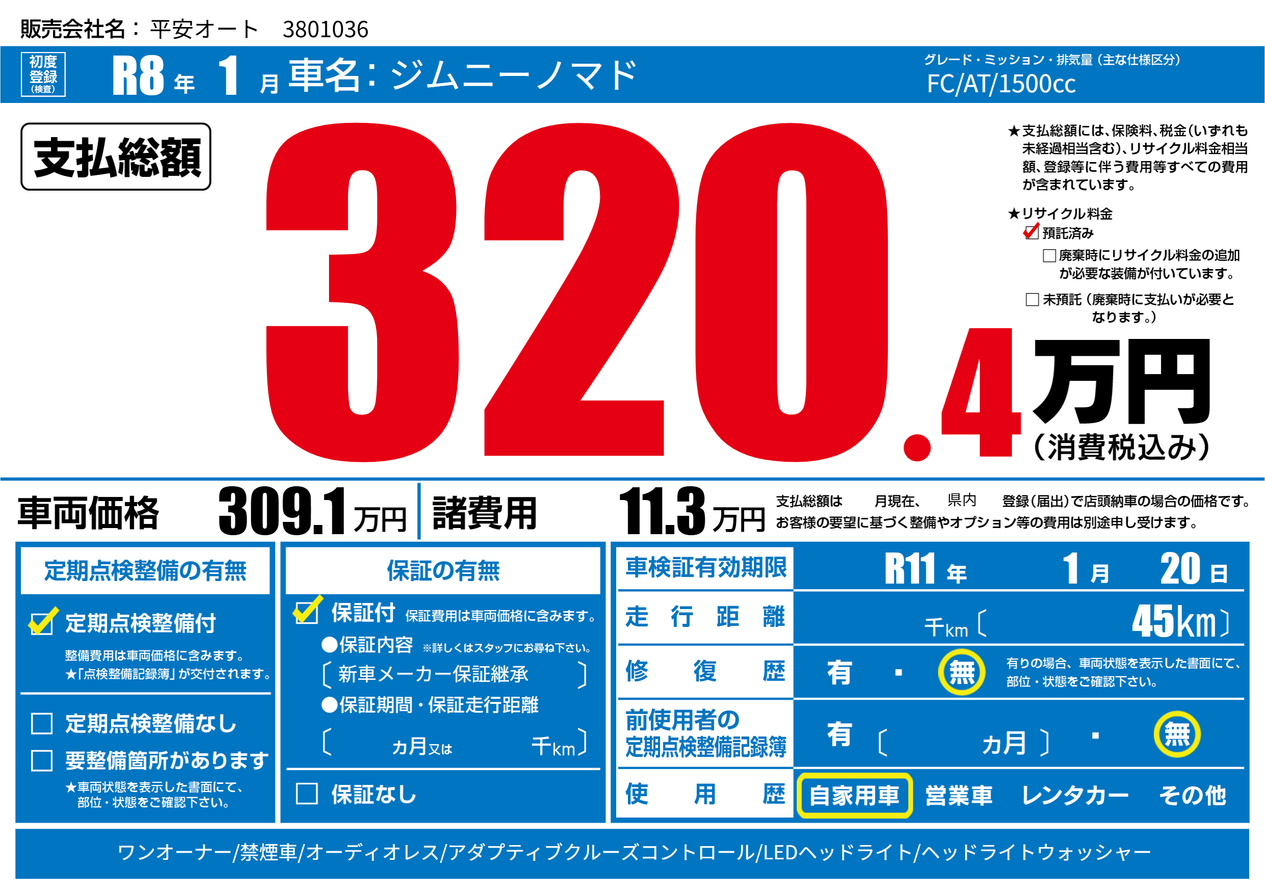 | 走行キロ | - | 初年度登録 | R8年1月 |