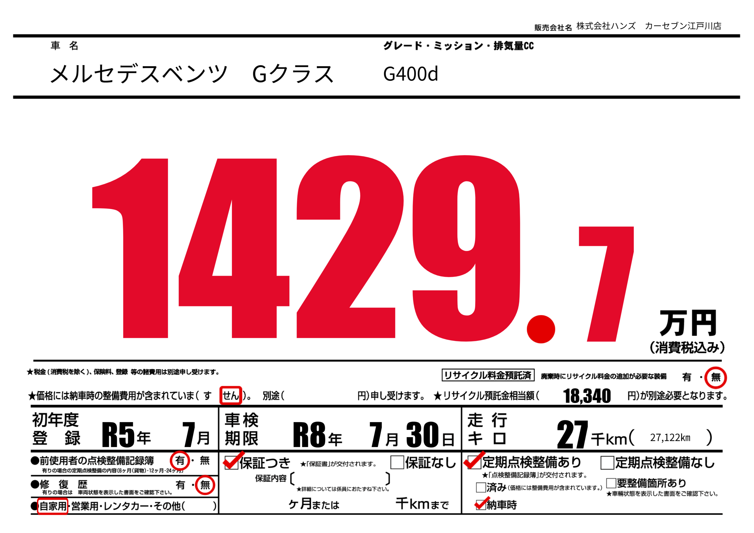 | 走行キロ | 2.7万km | 初年度登録 | R5年7月 |