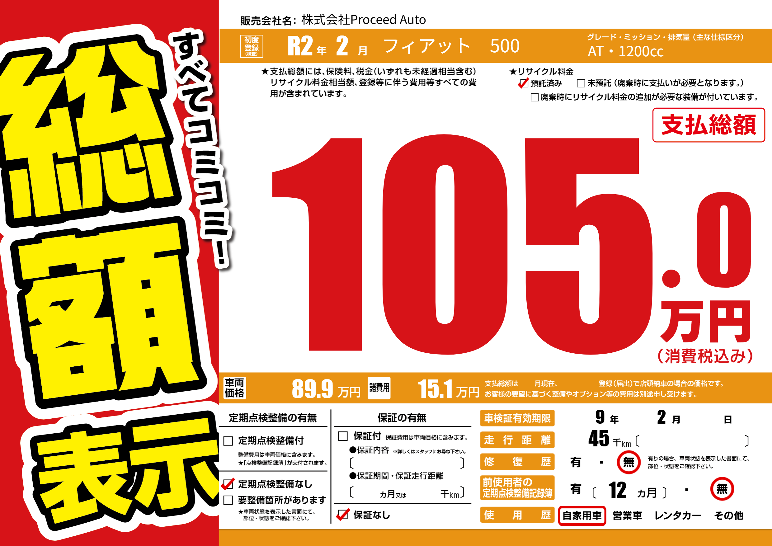 | 車名 | フィアット 500 | グレード ミッション 排気量 |