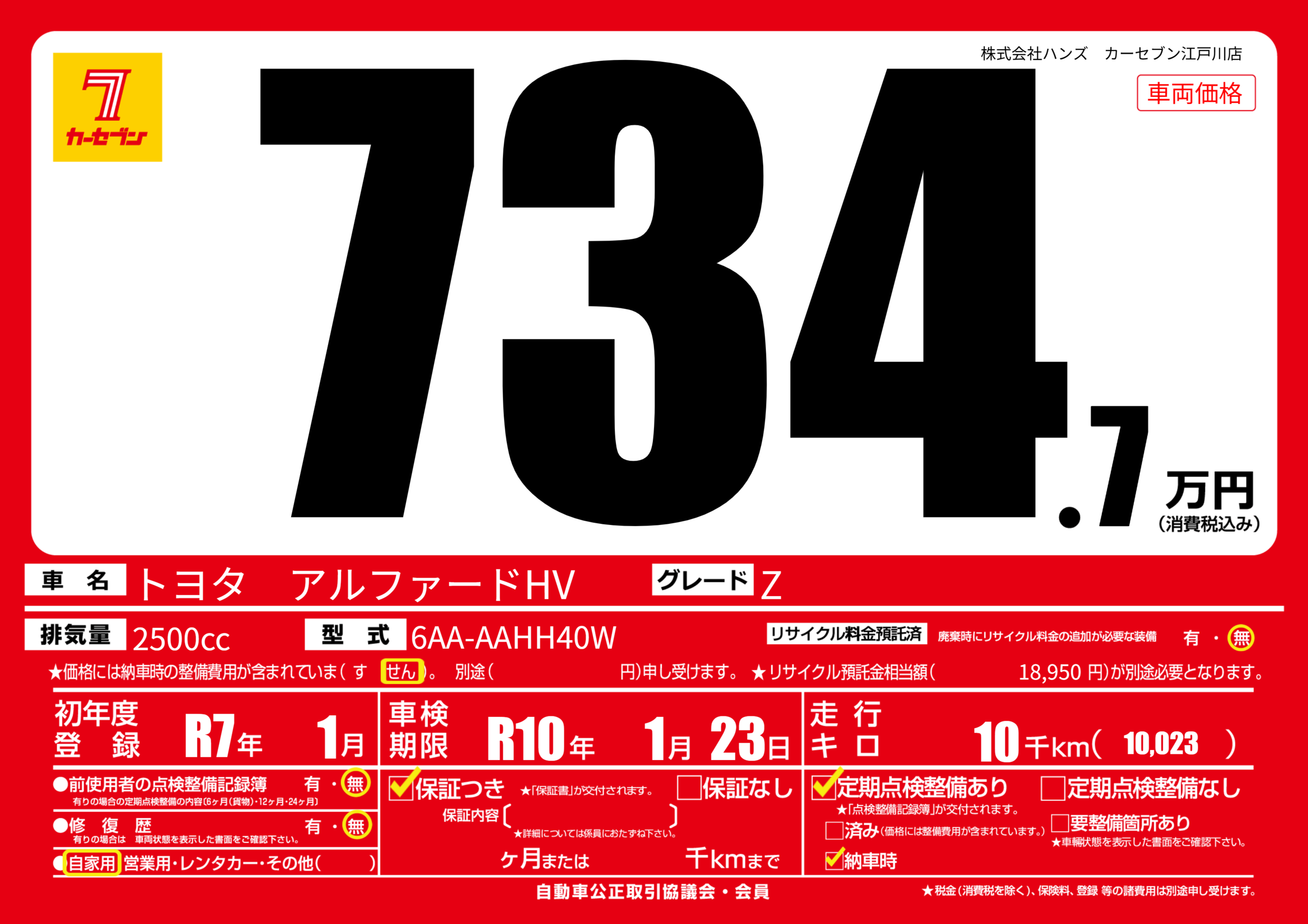 | 車名 | トヨタ アルファードHV | グレード ミッション 排気量 |