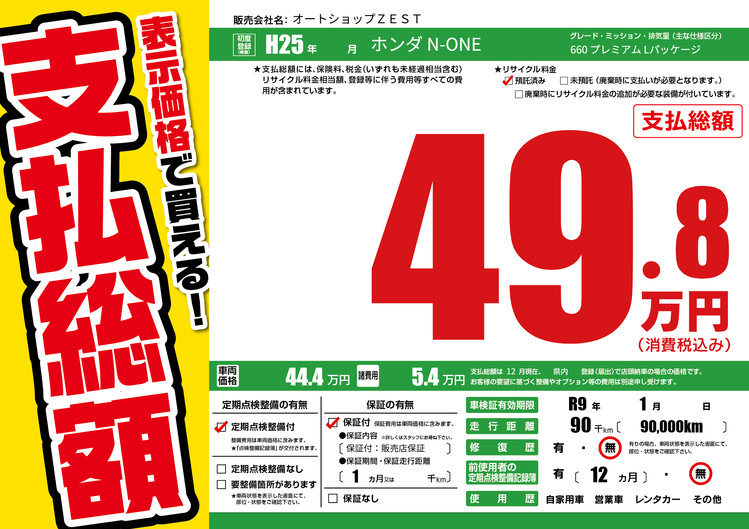 保証なし 保証内容(保証付:販売店保証) 1ヶ月または()千kmまで |