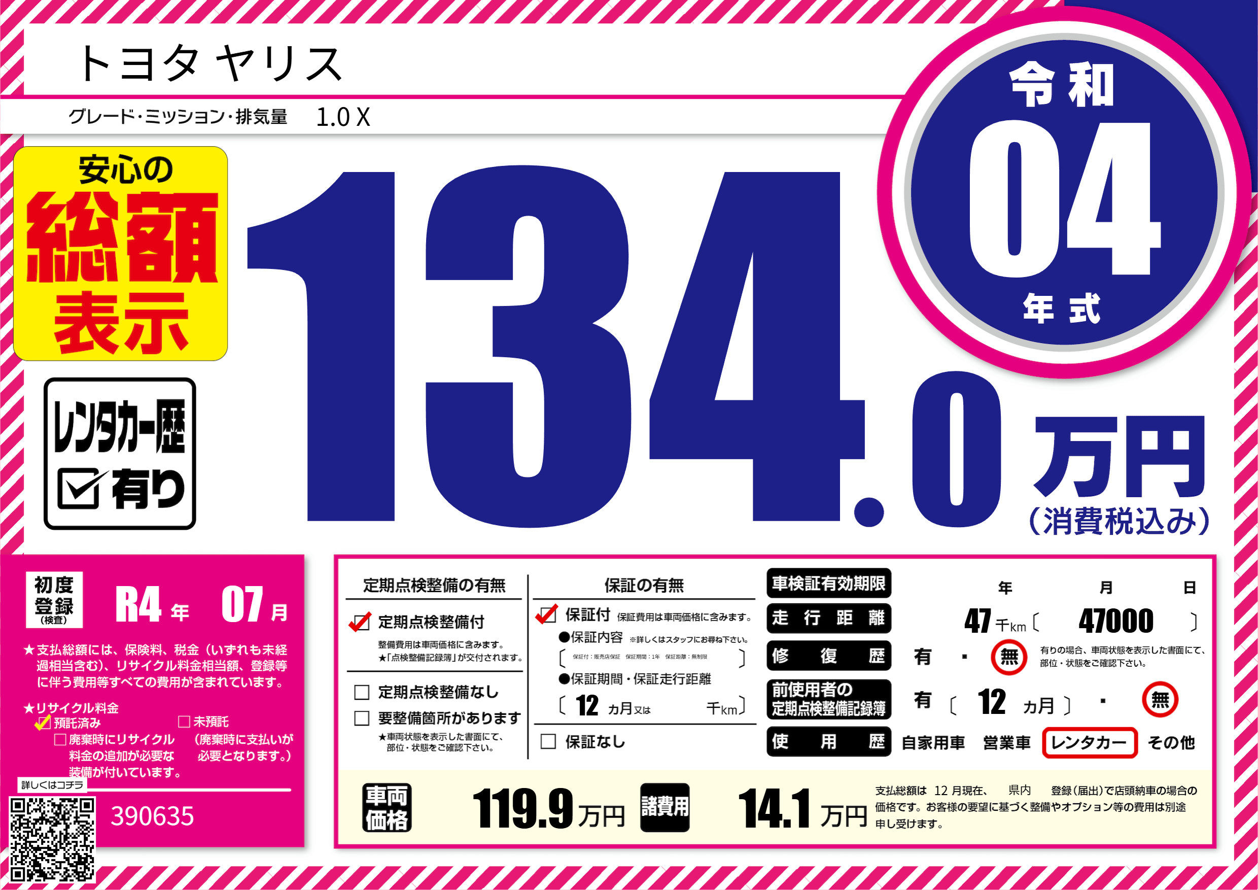 | 走行キロ | 4.7万km | 初年度登録 | R4年07月 |