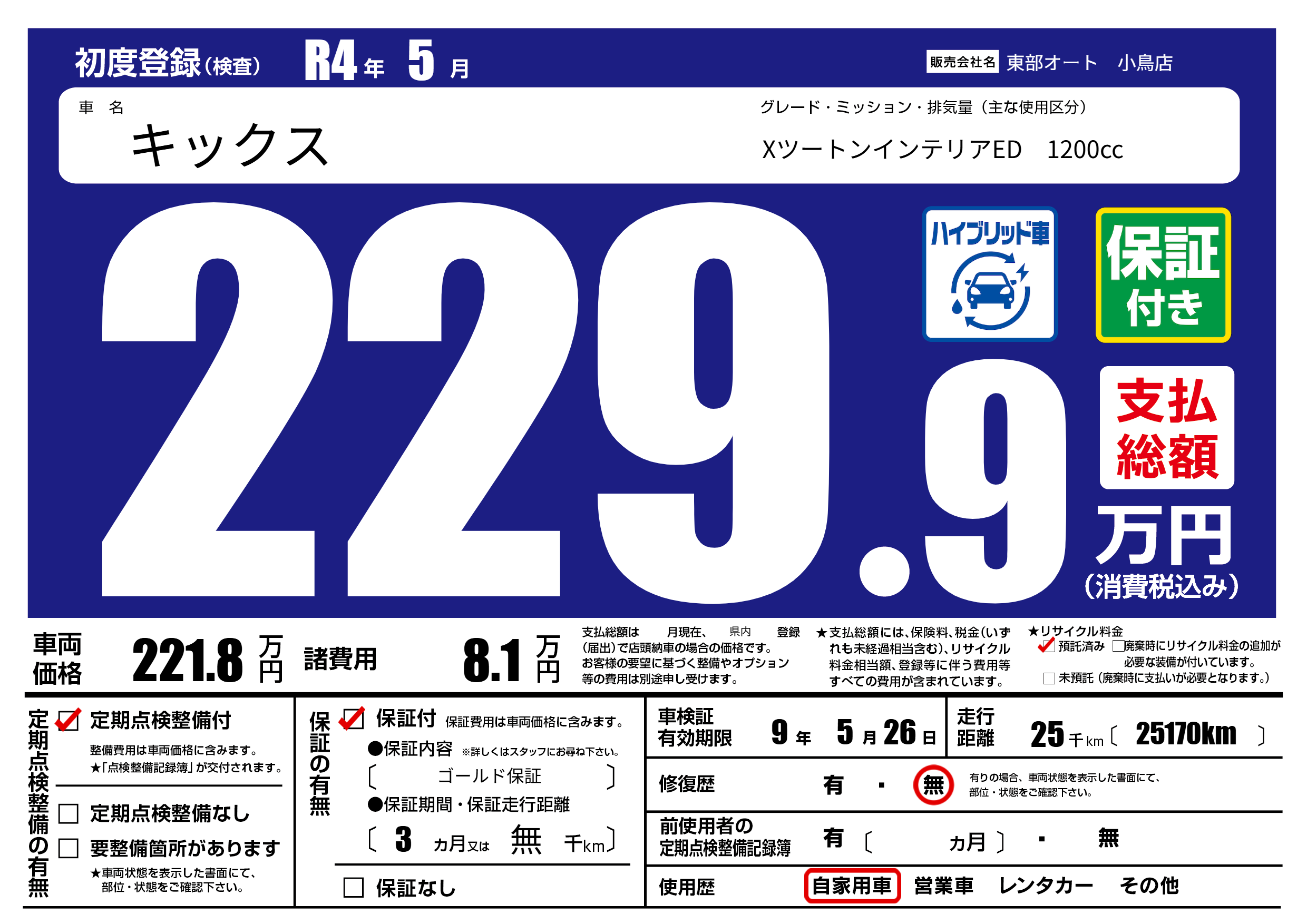 保証付き 保証内容( ゴールド保証) 3ヶ月または(無)千kmまで |