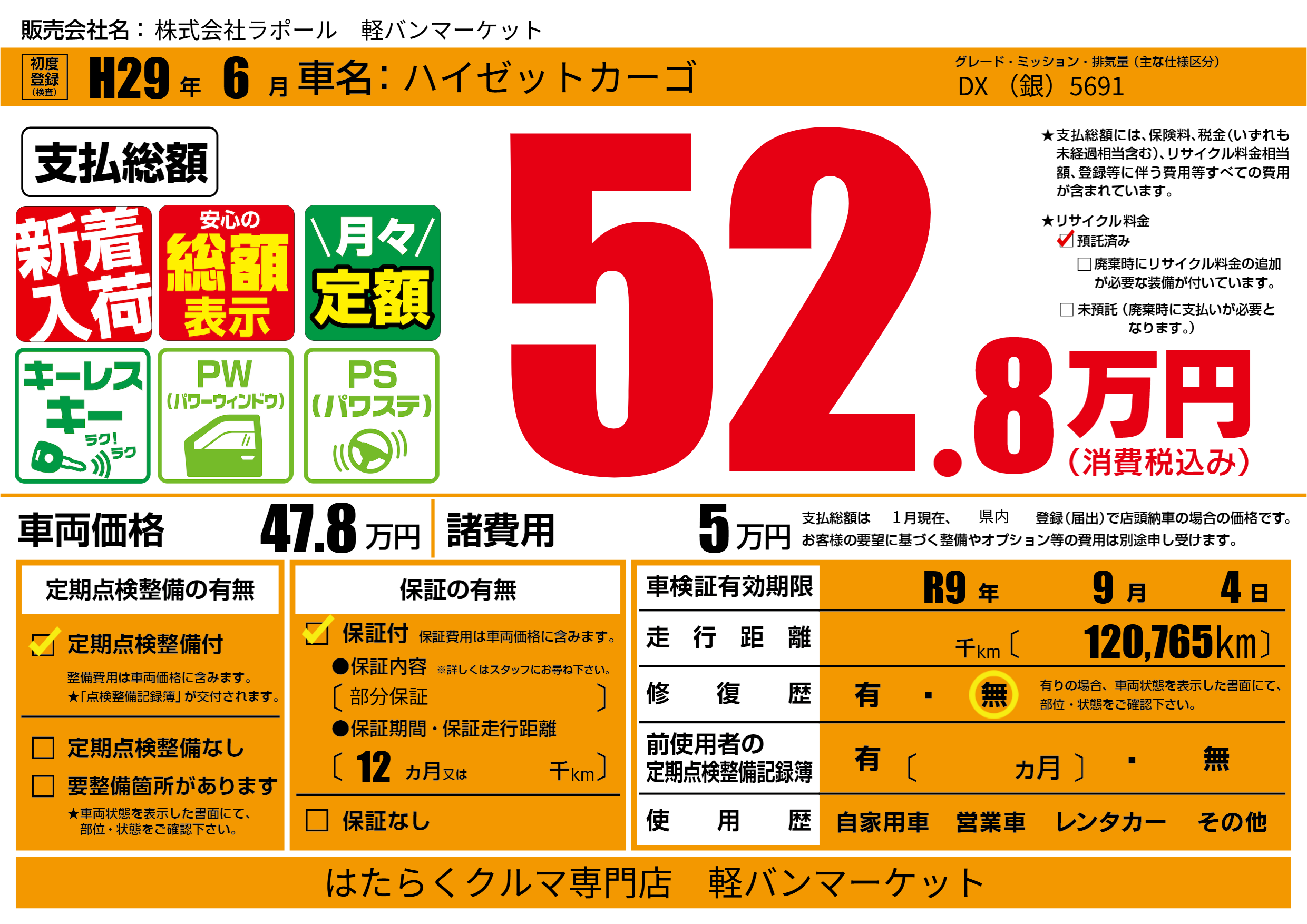 | 車名 | ハイゼットカーゴ | グレード ミッション 排気量 |