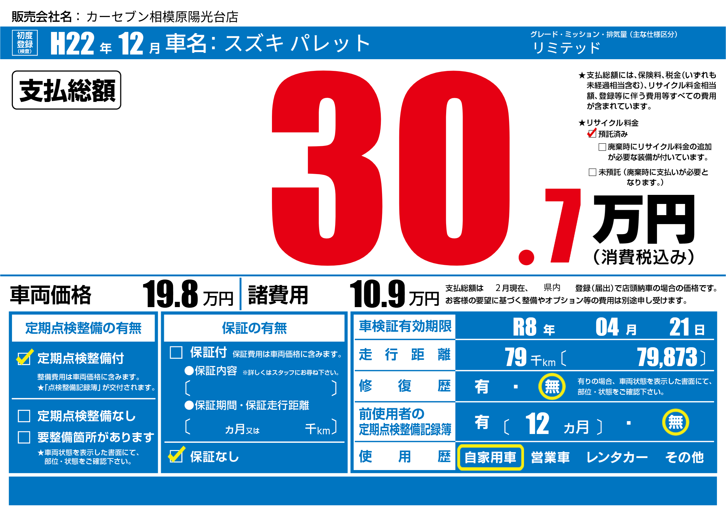 | 走行キロ | 7.9万km | 初年度登録 | H22年12月 |