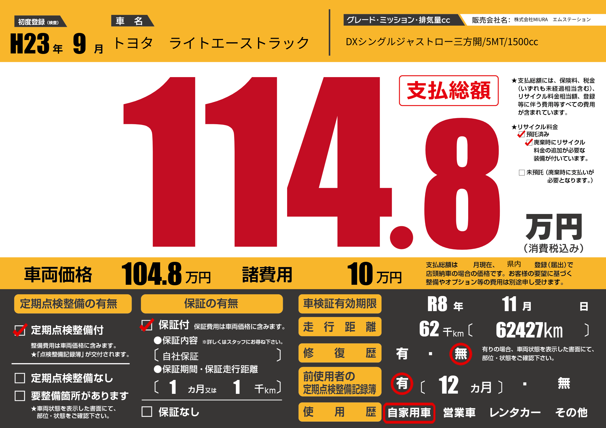 | 車検制限 | R8年 11月 - 日 | ||