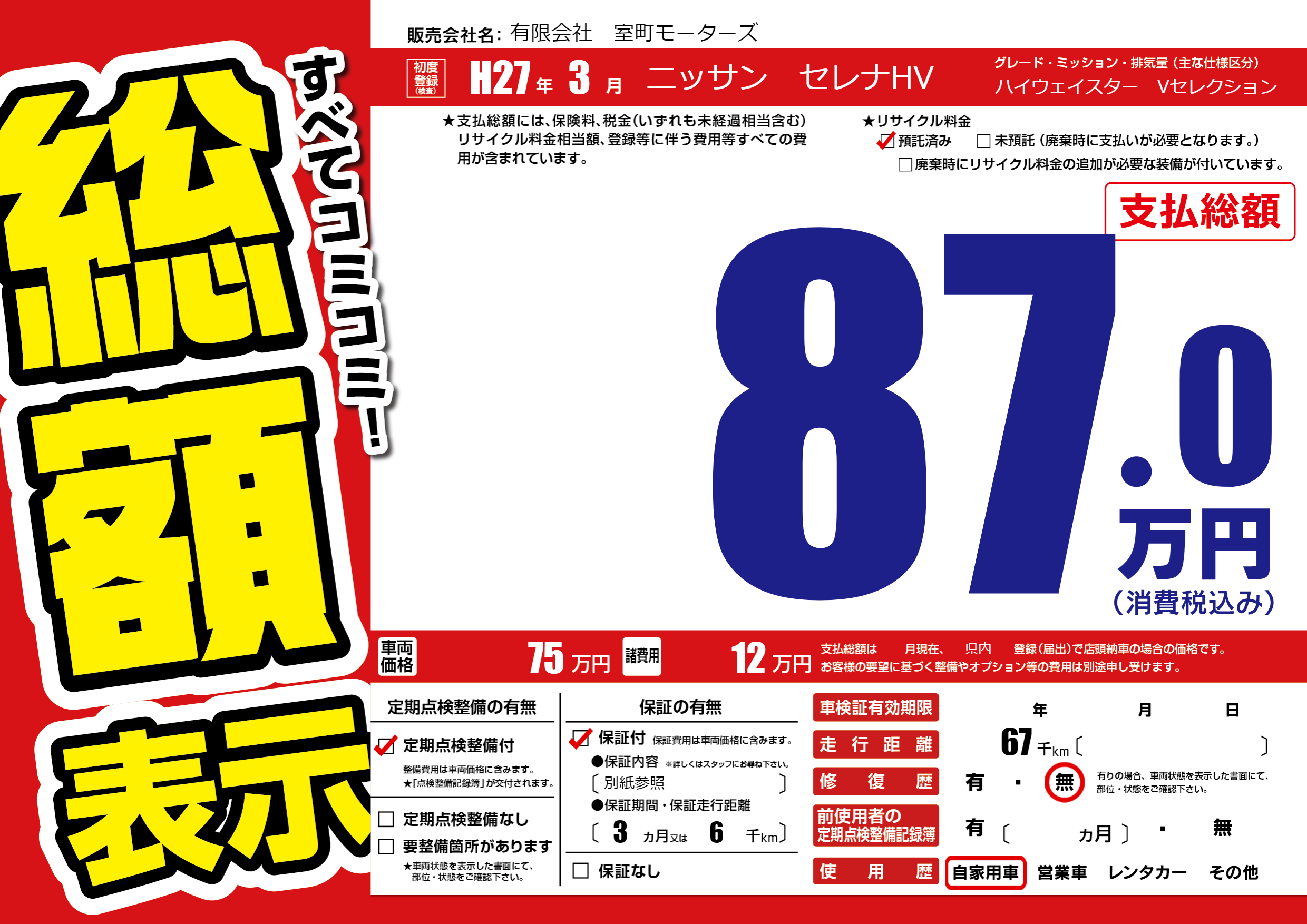 保証付き 保証内容(別紙参照) 3ヶ月または(6)千kmまで |