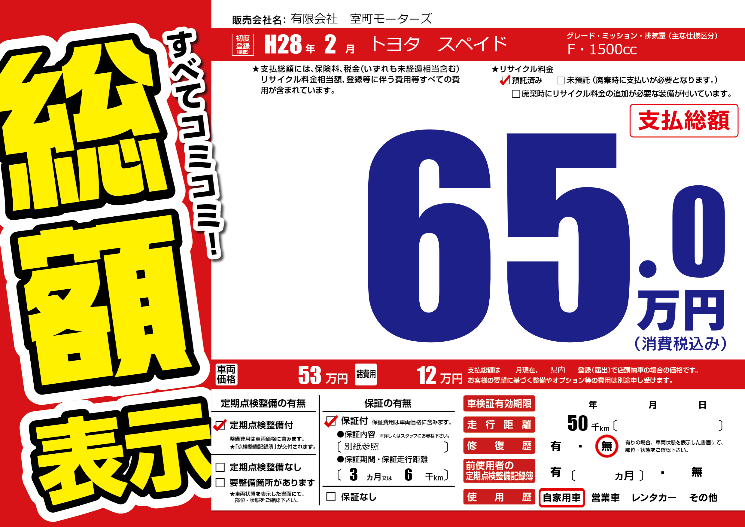 | 車名 | トヨタ スペイド | グレード ミッション 排気量 |