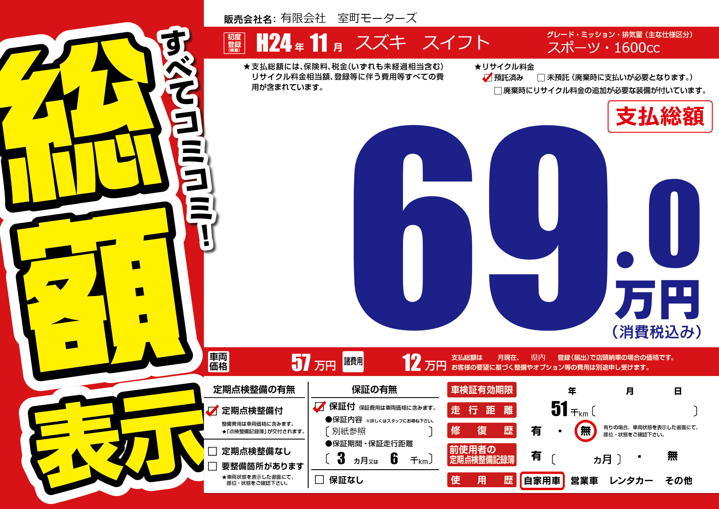 | 車名 | スズキ スイフト | グレード ミッション 排気量 |