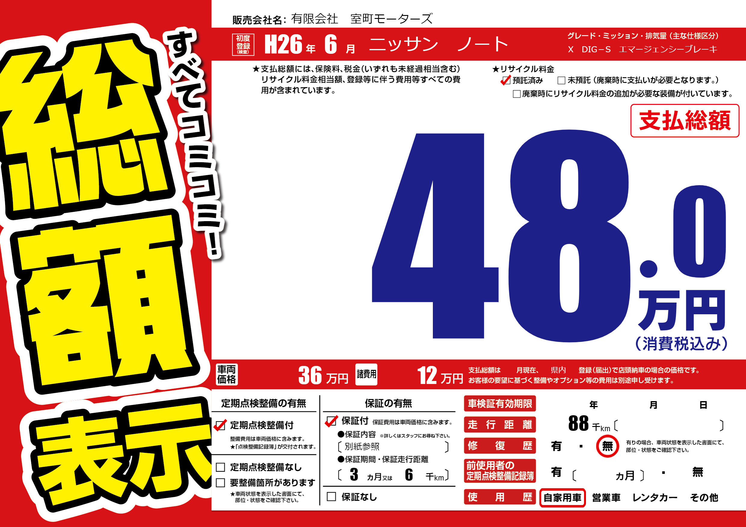 保証付き 保証内容(別紙参照) 3ヶ月または(6)千kmまで |