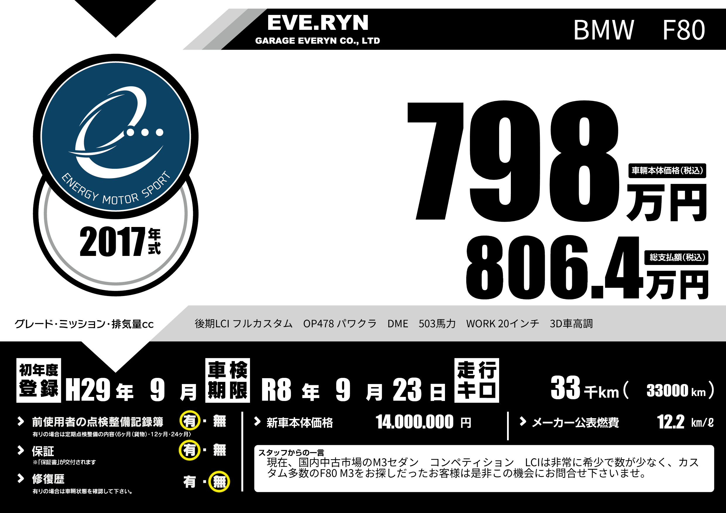 | 車名 | BMW F80 | グレード ミッション 排気量 |
