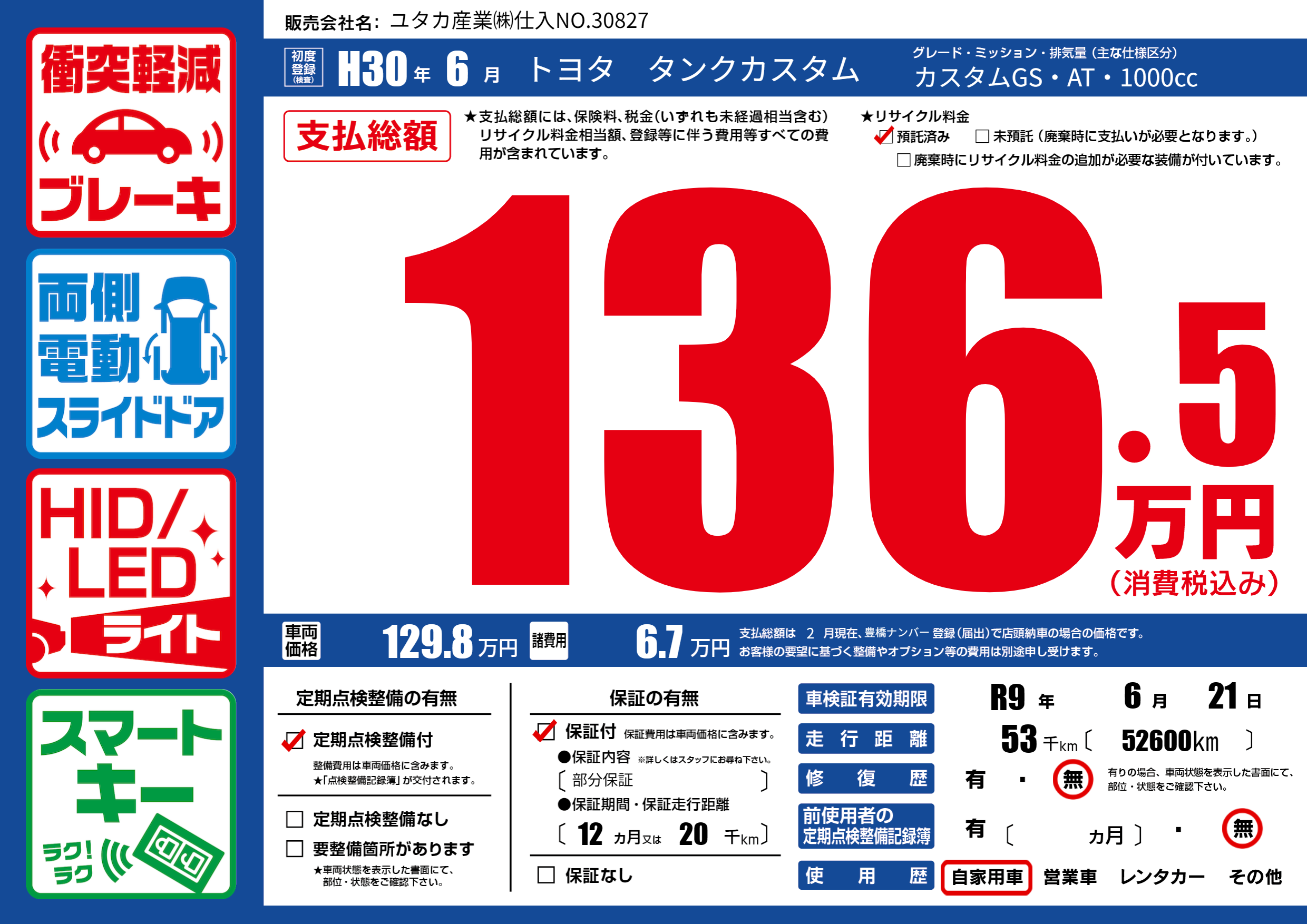| 車名 | トヨタ タンクカスタム | グレード ミッション 排気量 |