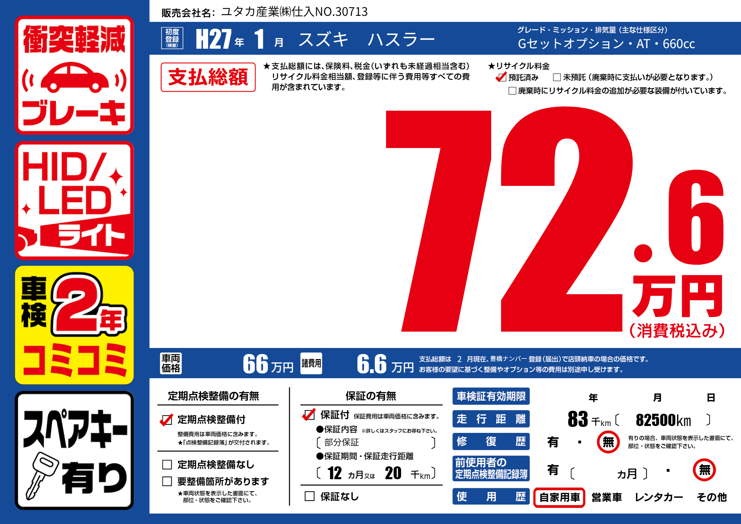 | 走行キロ | 8.3万km | 初年度登録 | H27年1月 |