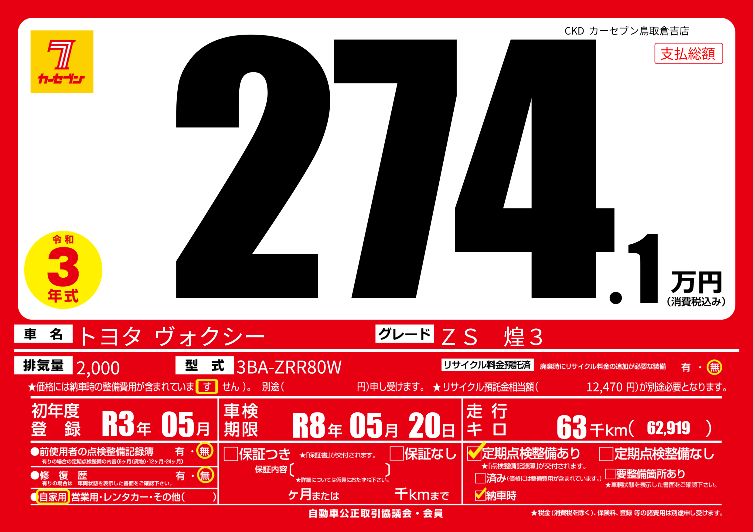 | 走行キロ | 6.3万km | 初年度登録 | R3年05月 |