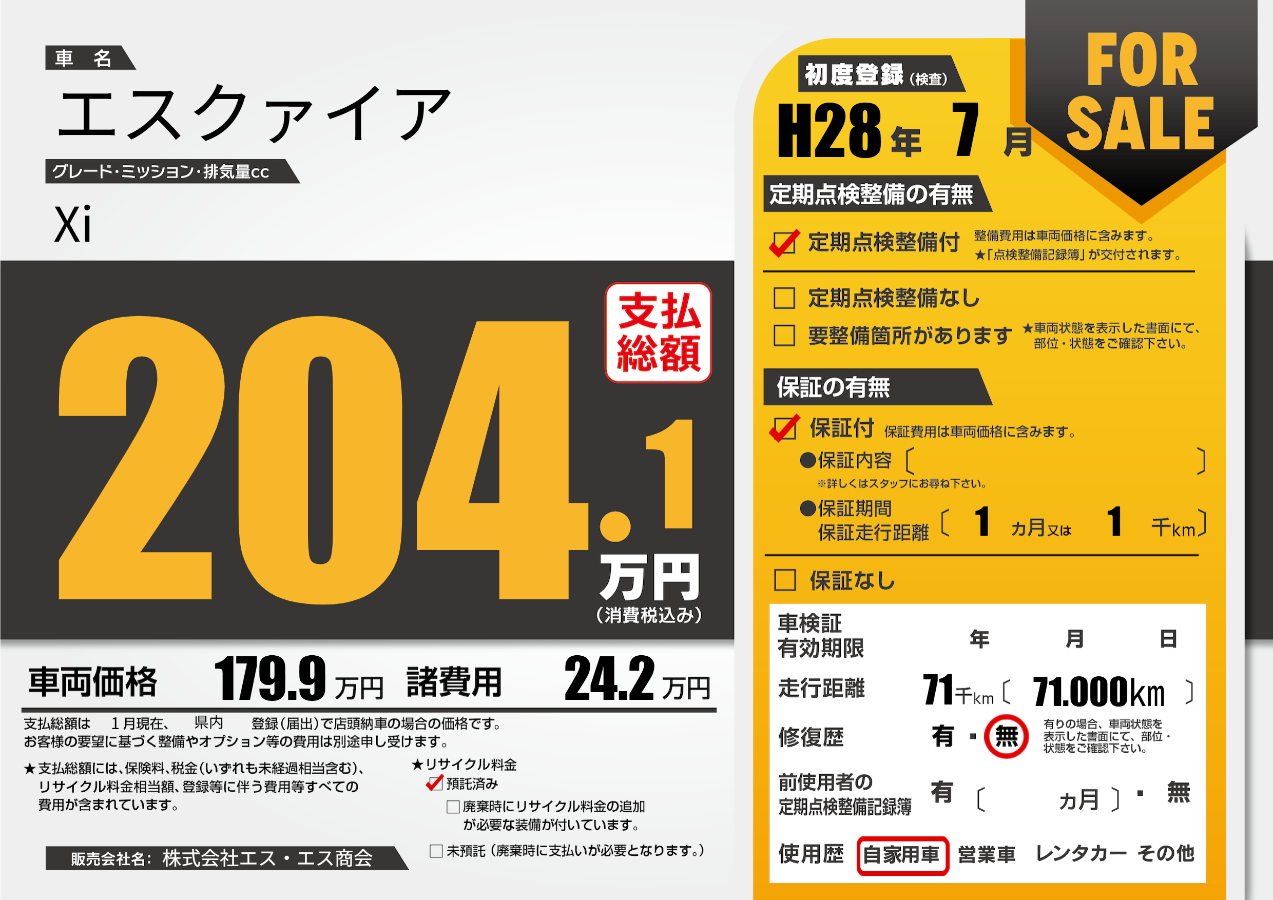 | 走行キロ | 7.1万km | 初年度登録 | H28年7月 |