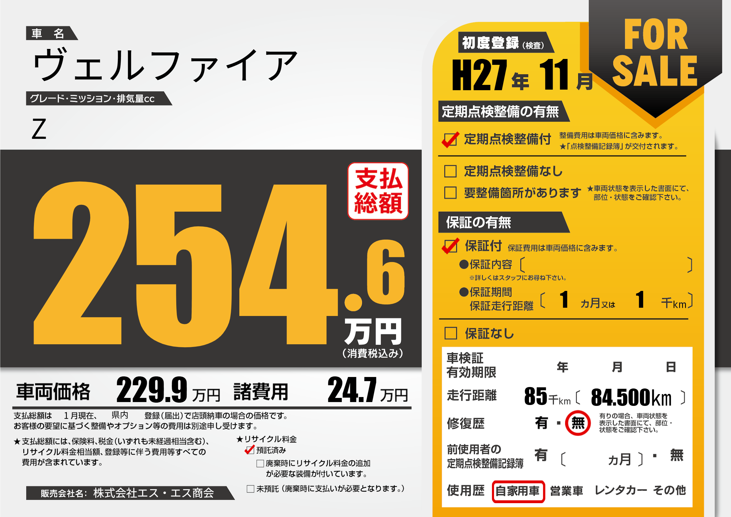 | 走行キロ | 8.5万km | 初年度登録 | H27年11月 |