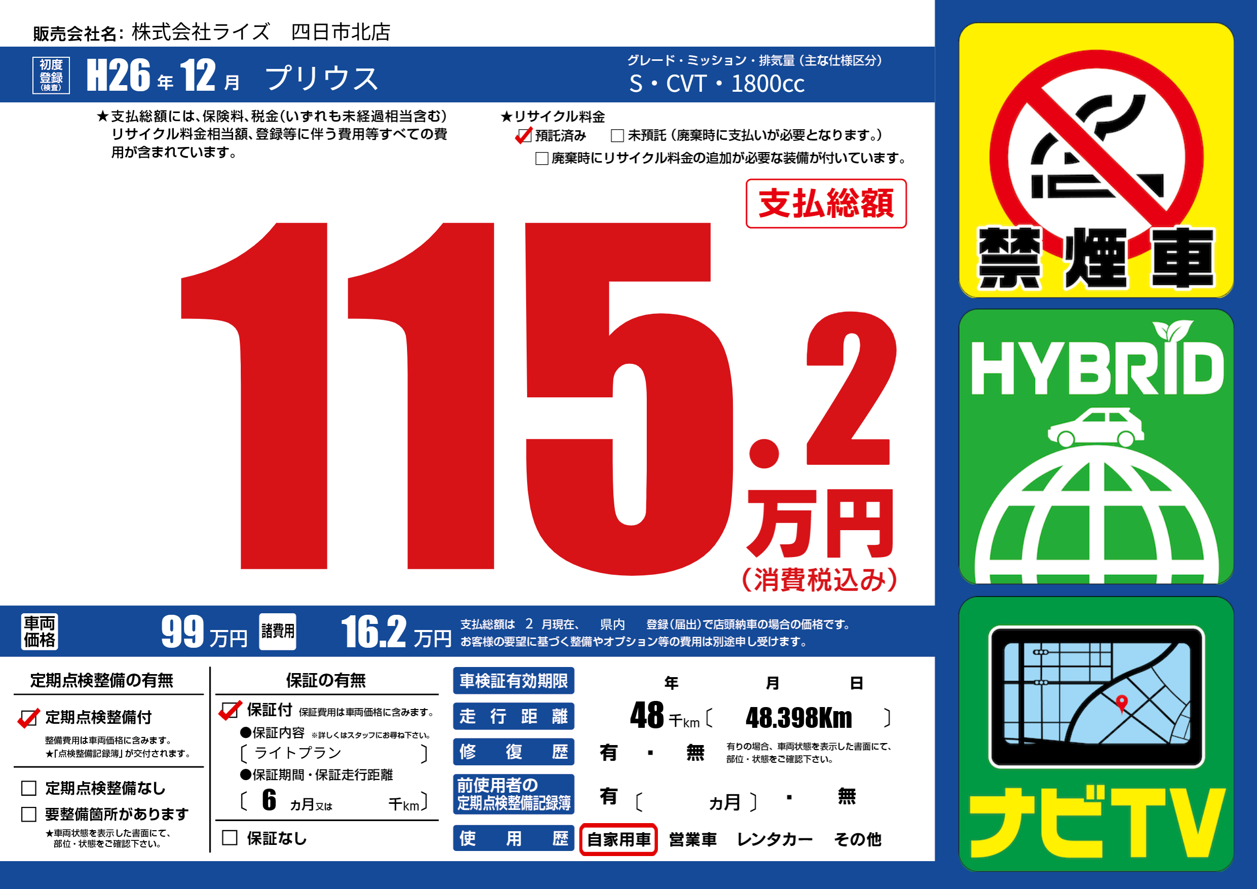 | 走行キロ | 4.8万km | 初年度登録 | H26年12月 |
