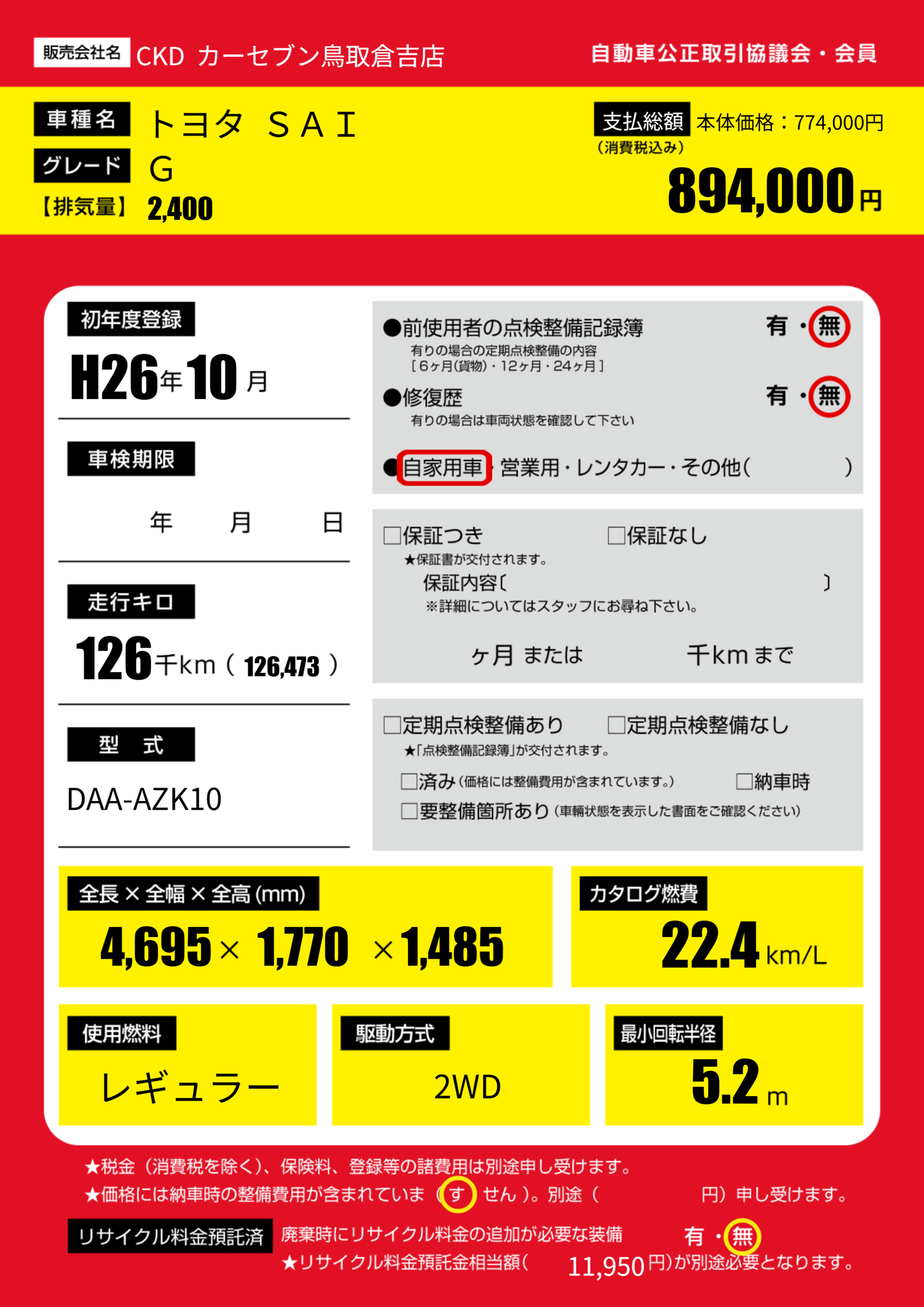 | 走行キロ | 12.6万km | 初年度登録 | H26年10月 |