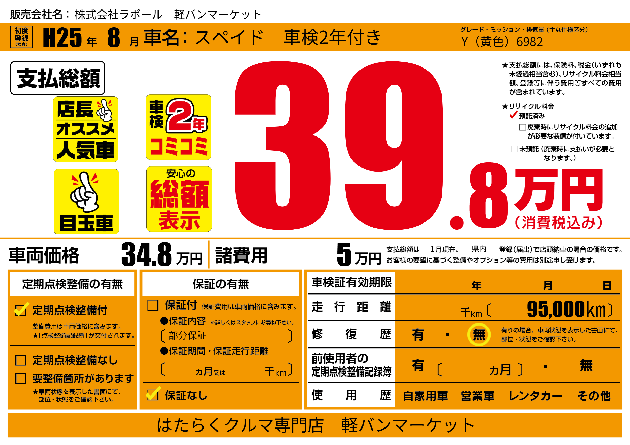 | 車名 | スペイド 車検2年付き | グレード ミッション 排気量 |
