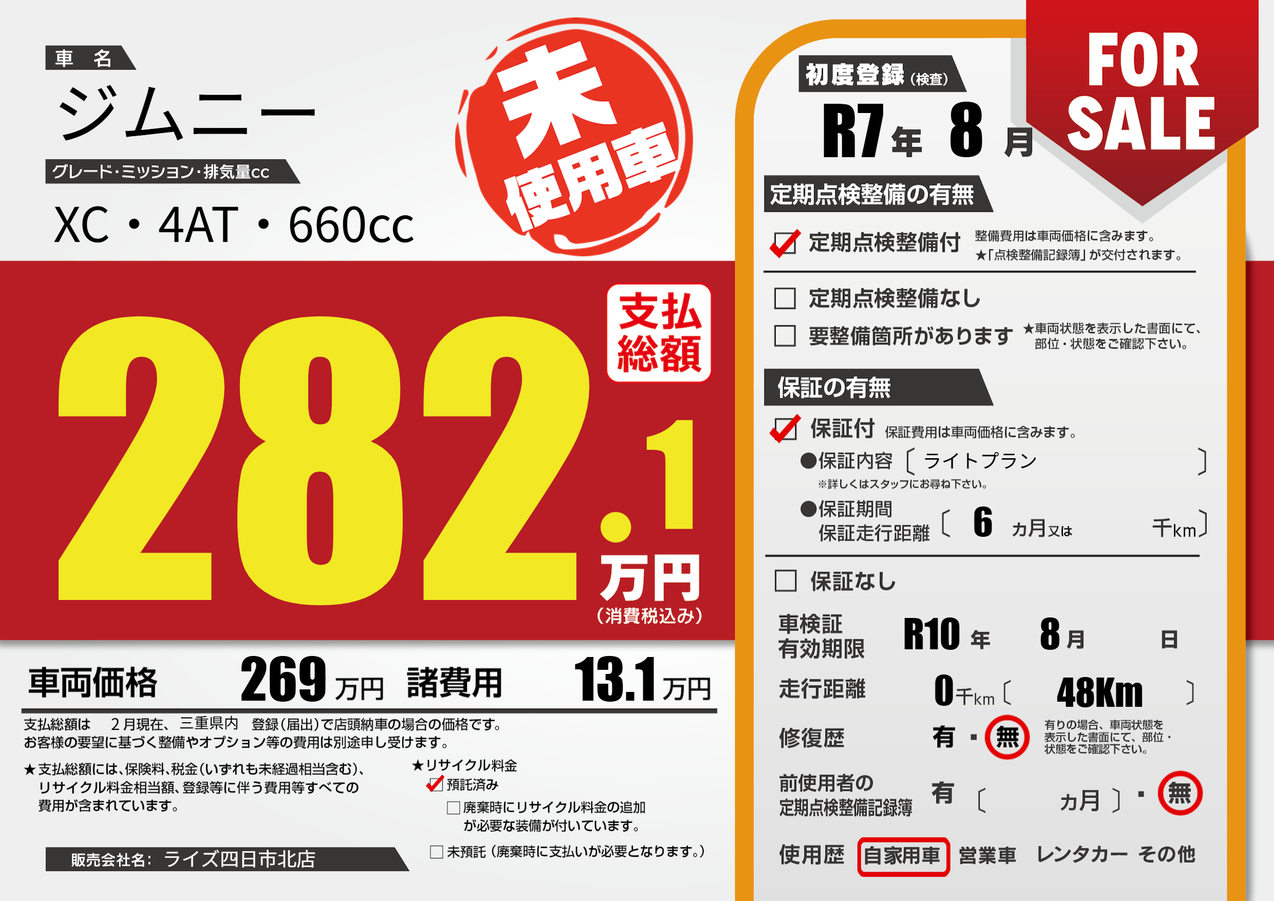 | 車検制限 | R10年 8月 - 日 | ||