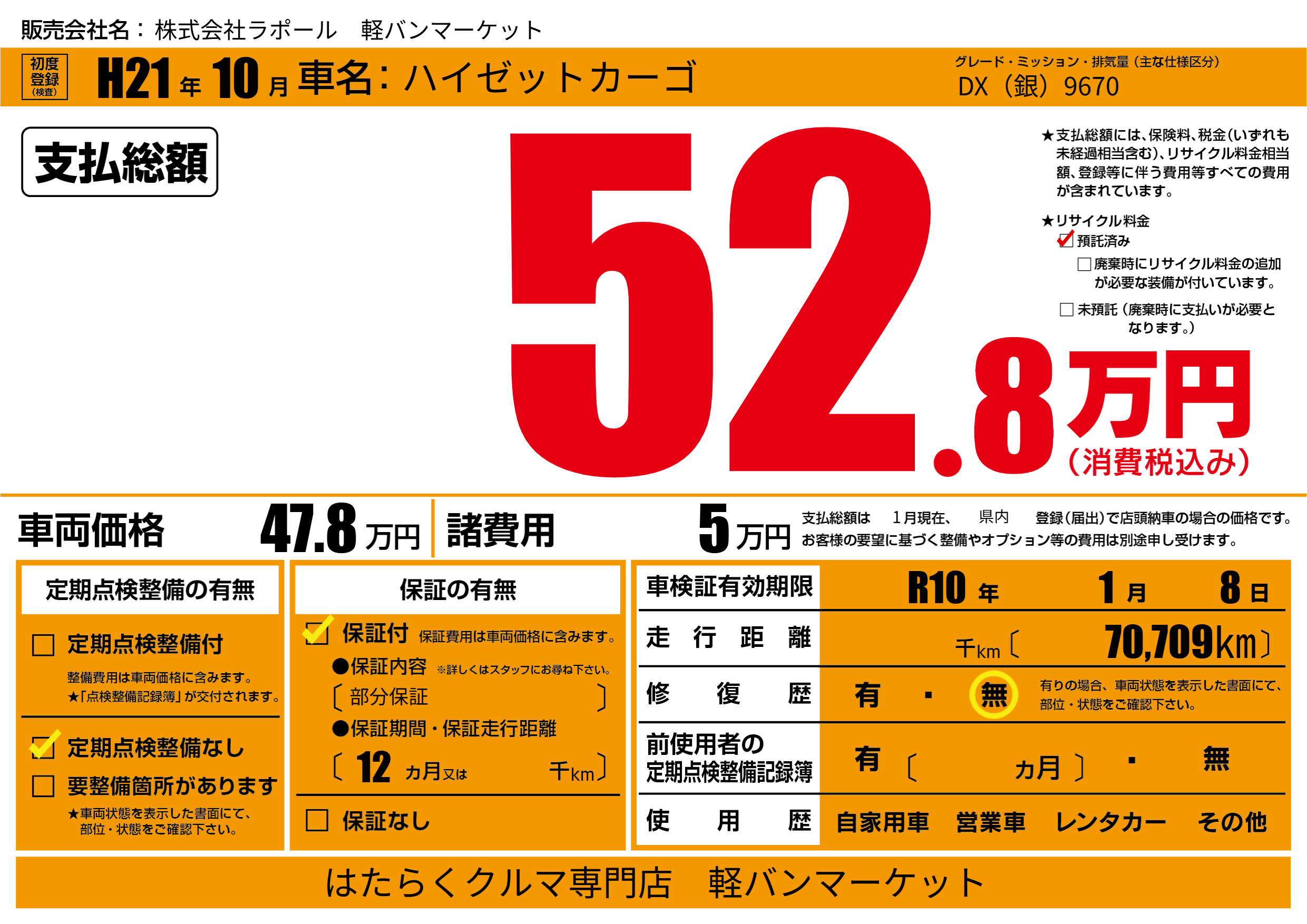 保証付き 保証内容(部分保証) 12ヶ月または()千kmまで |