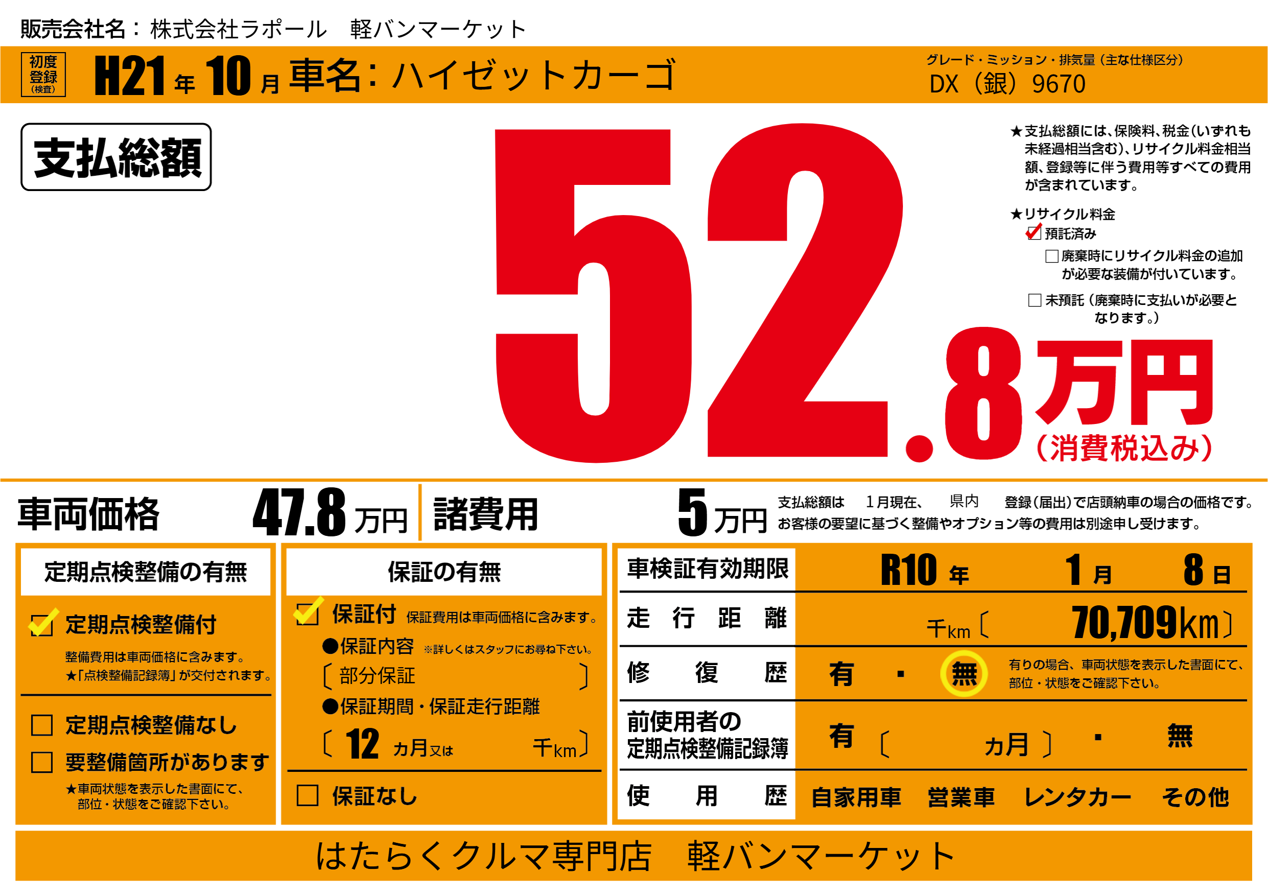 | 車名 | ハイゼットカーゴ | グレード ミッション 排気量 |
